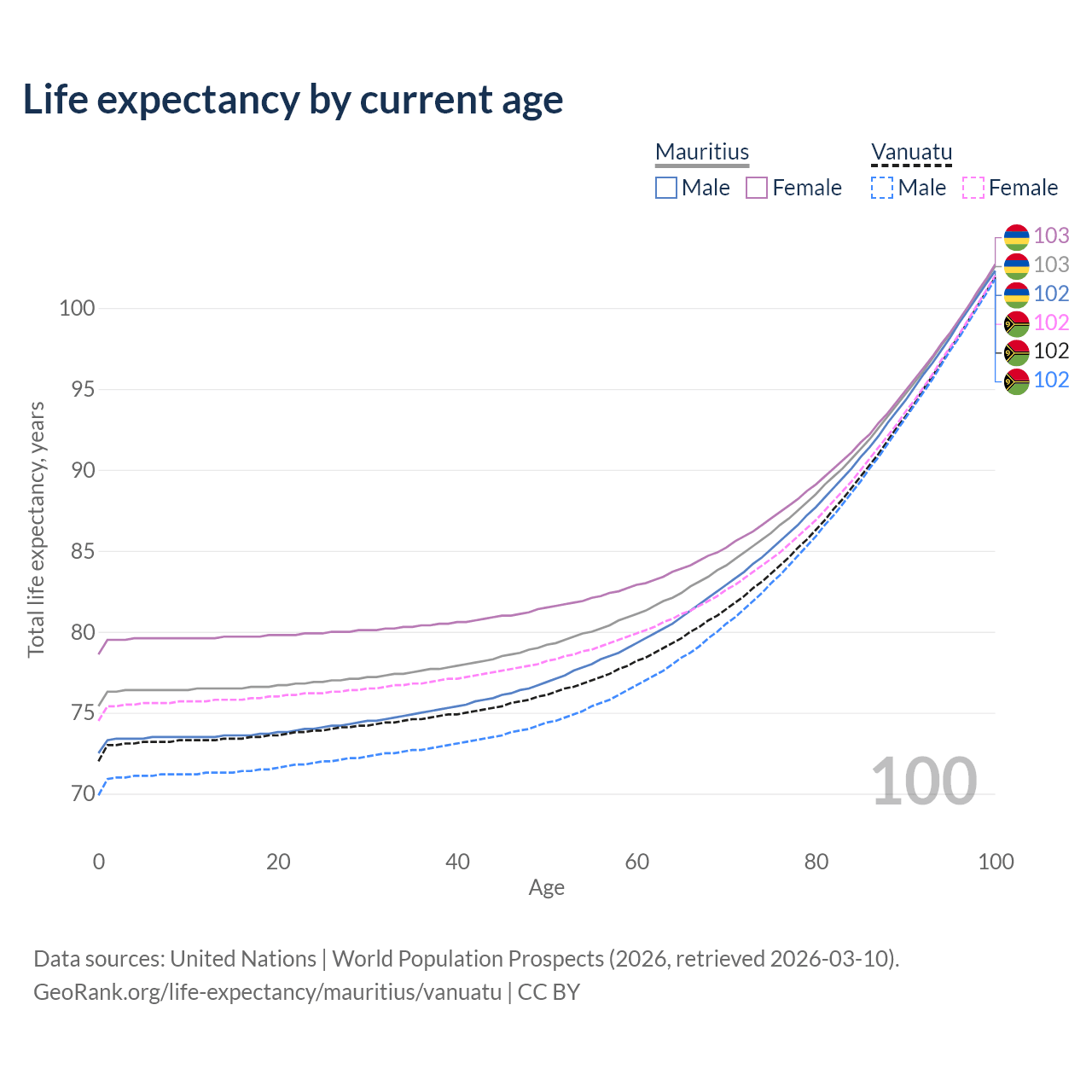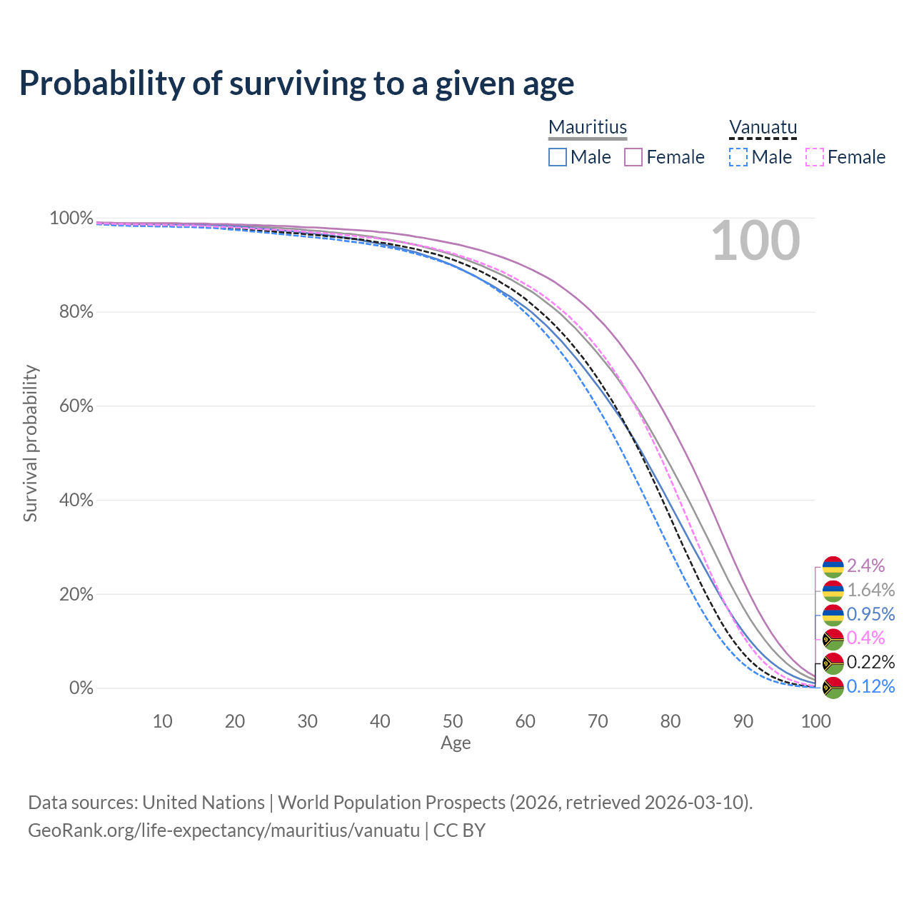 This life expectancy calculator shows the odds of living to 100, 95, 90, and below based on current age for both males and females in Mauritius and Vanuatu, along with mean and median age of death. The calculations are based on the 2026 life tables (actuarial tables) from the UN World Population Prospects.