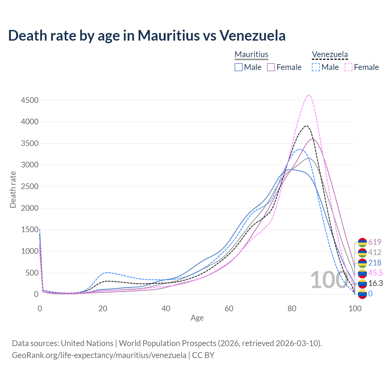 This life expectancy calculator shows the odds of living to 100, 95, 90, and below based on current age for both males and females in Mauritius and Venezuela, along with mean and median age of death. The calculations are based on the 2026 life tables (actuarial tables) from the UN World Population Prospects.