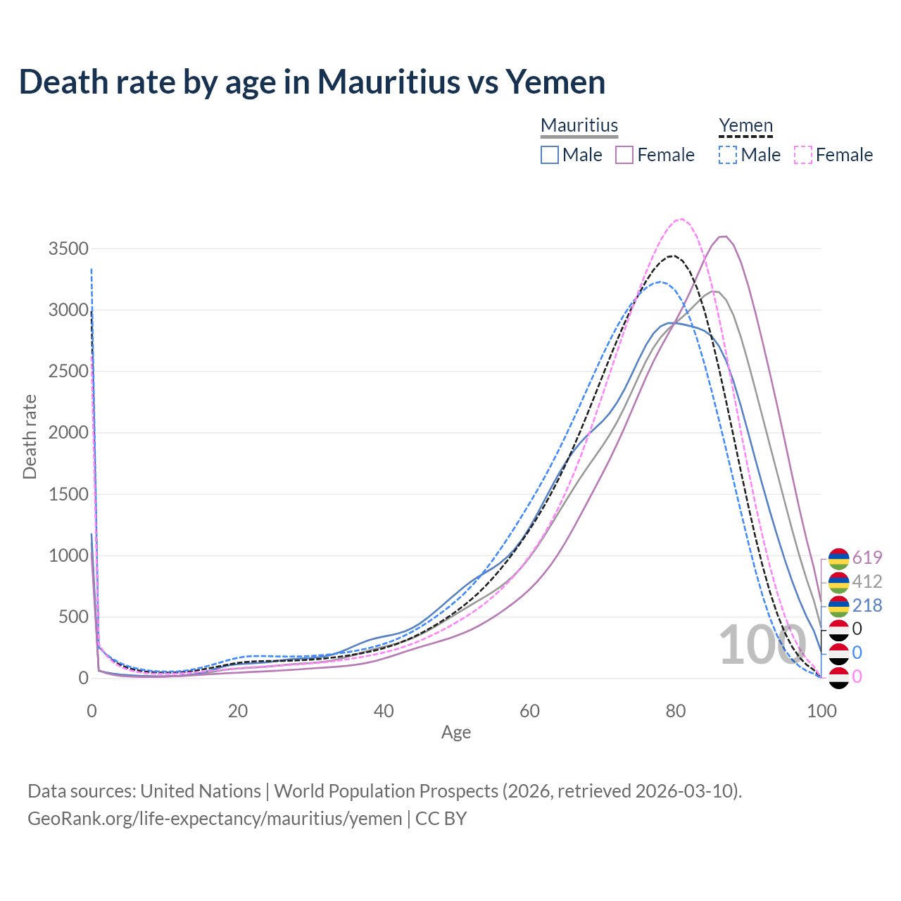 In Mauritius, the most common age of death is 85, compared to 80 in Yemen. The median age of death is 79.1 in Mauritius and 74.9 in Yemen, meaning only half of each cohort is expected to live past that age.