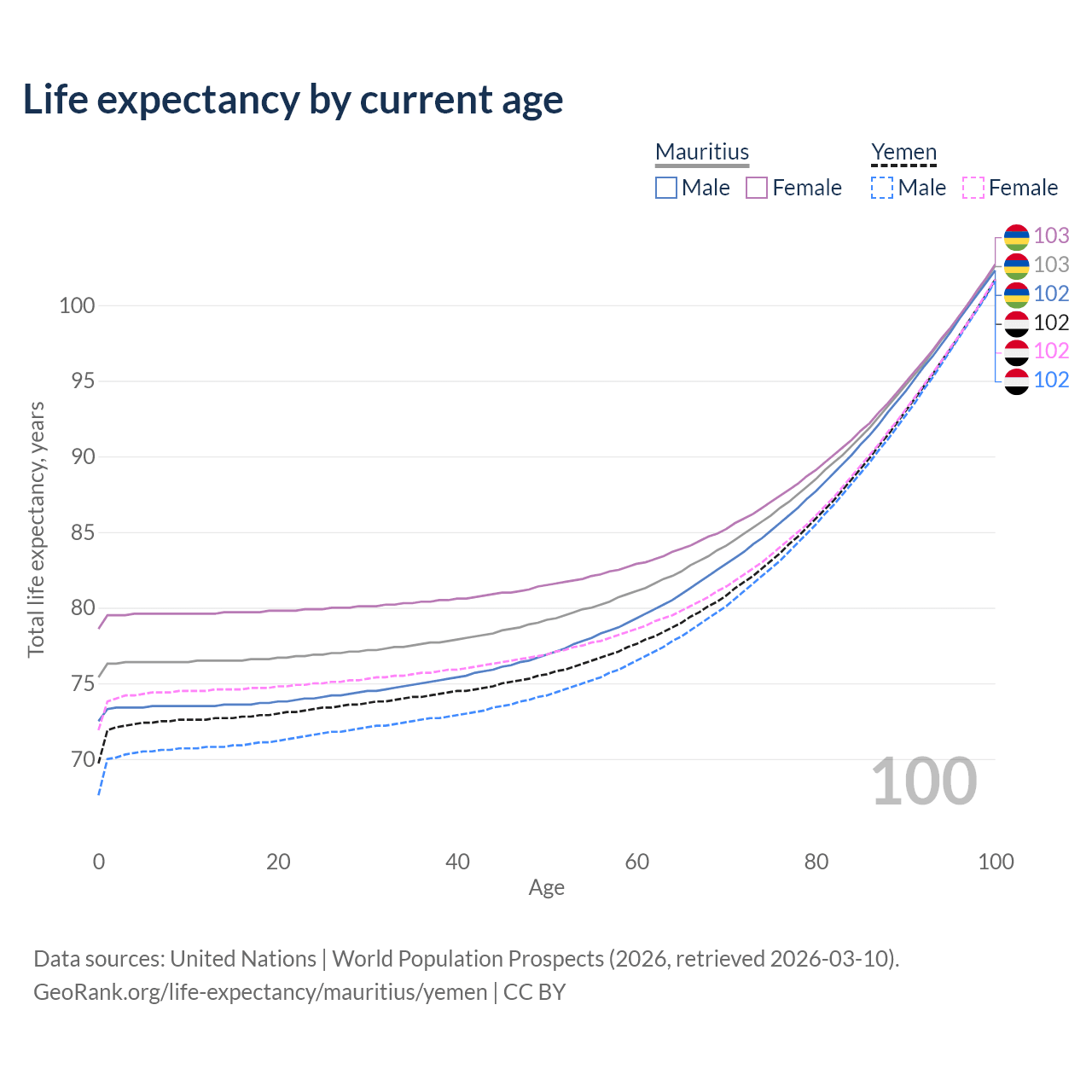 This life expectancy calculator shows the odds of living to 100, 95, 90, and below based on current age for both males and females in Mauritius and Yemen, along with mean and median age of death. The calculations are based on the 2026 life tables (actuarial tables) from the UN World Population Prospects.