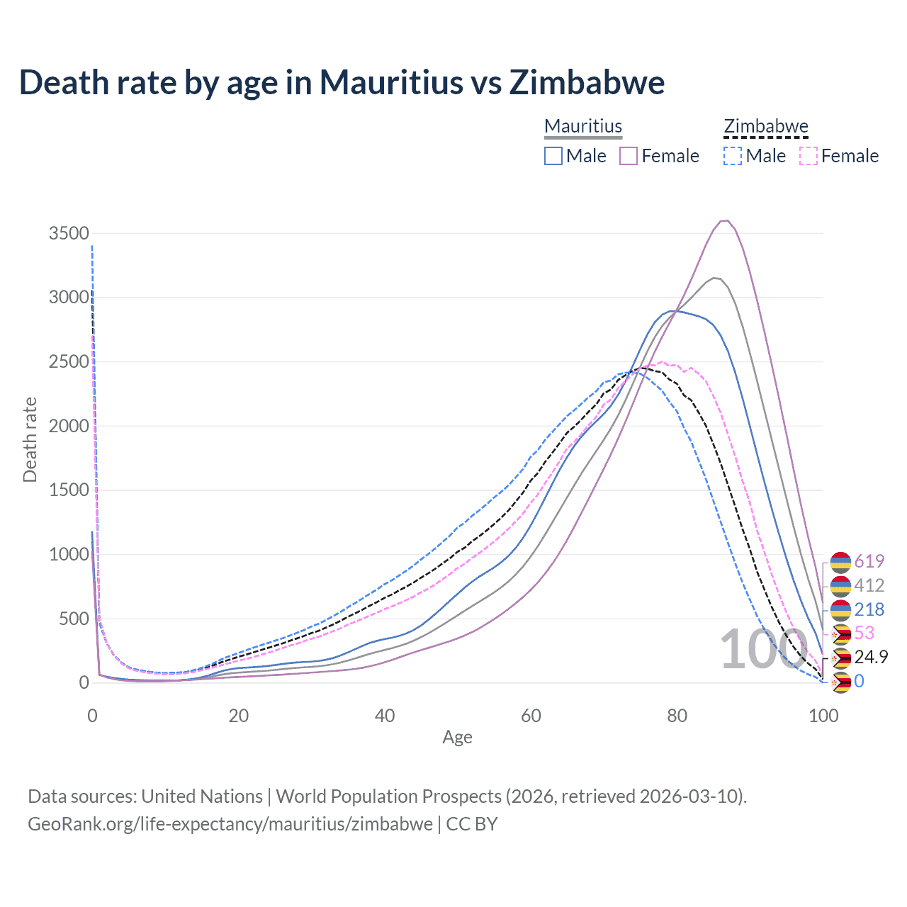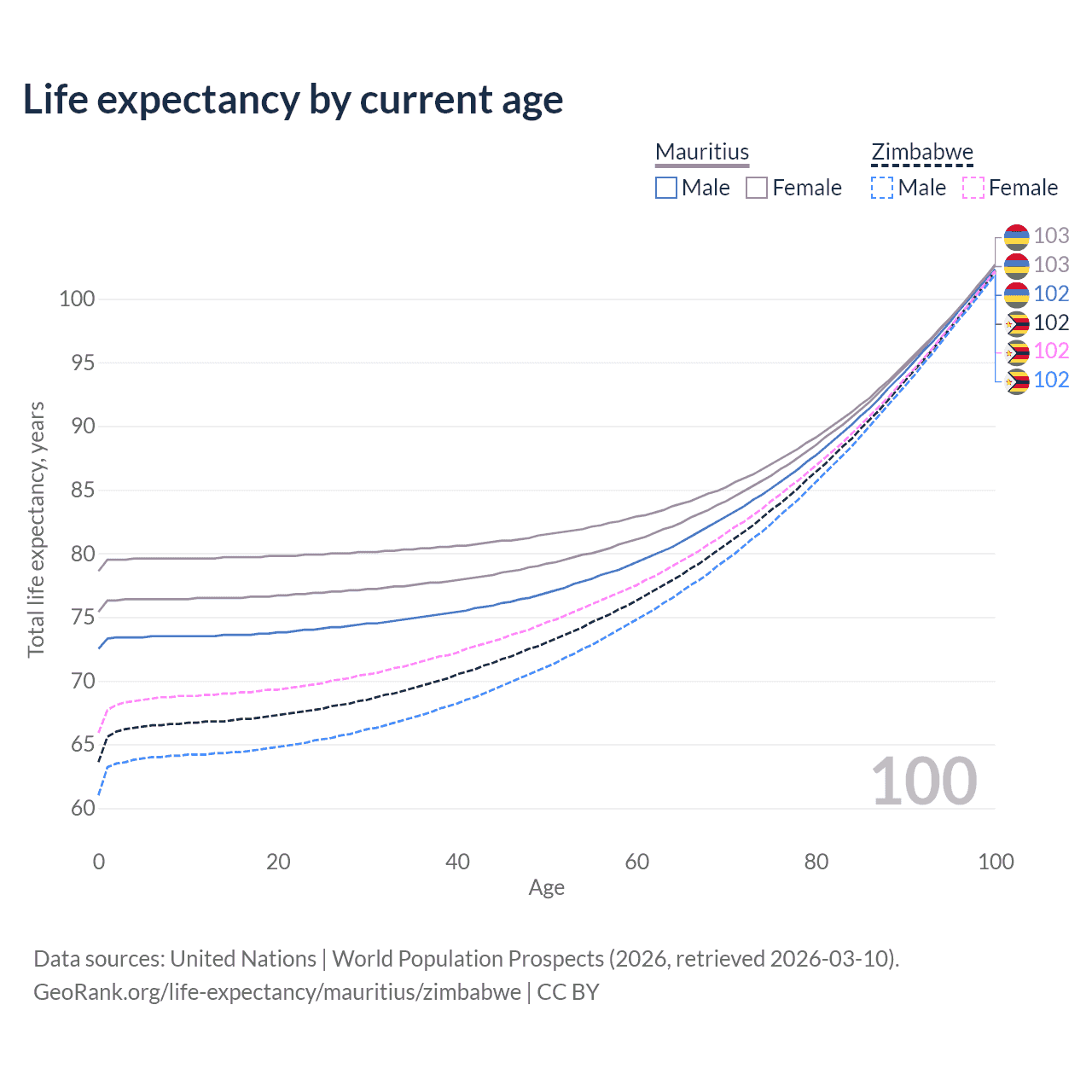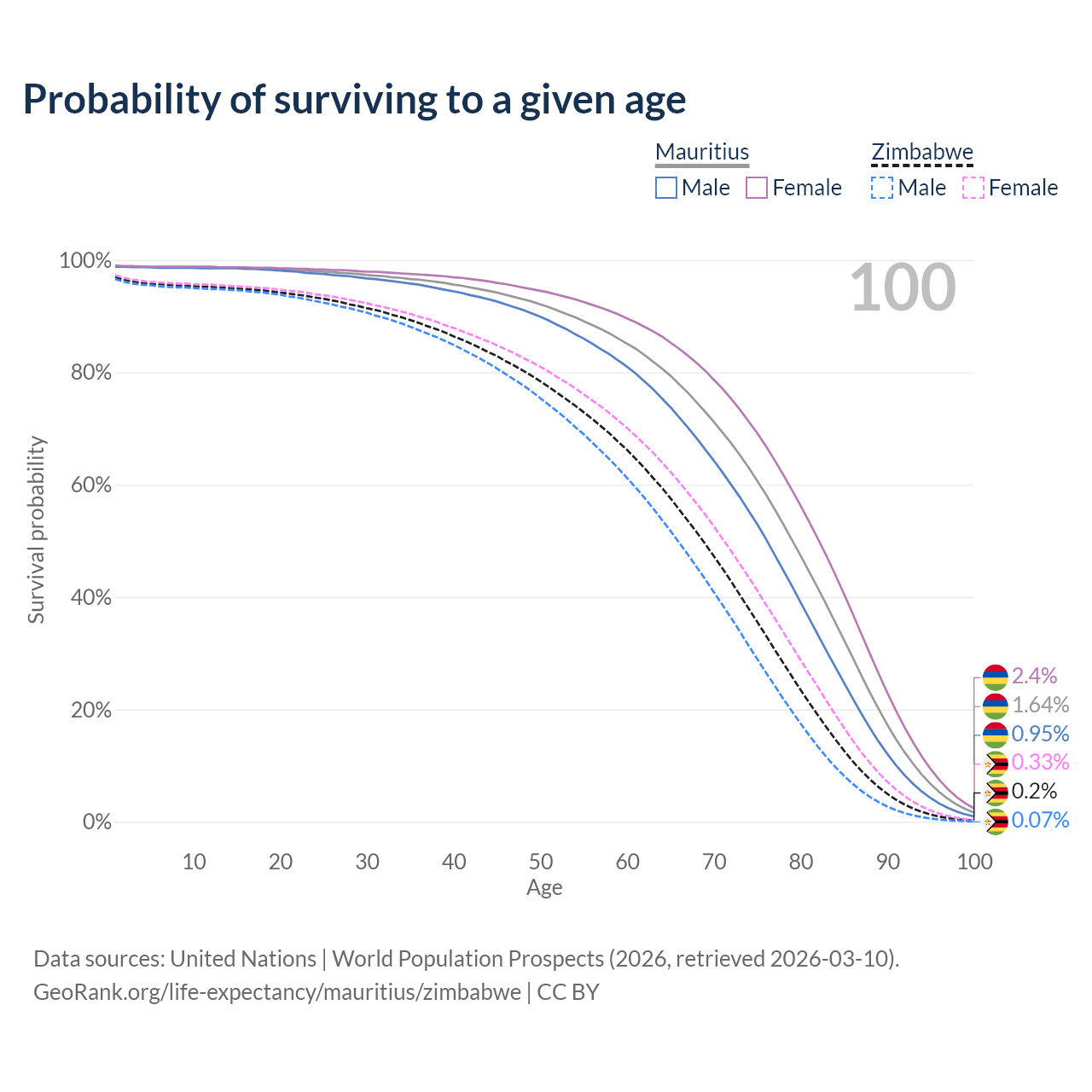 This life expectancy calculator shows the odds of living to 100, 95, 90, and below based on current age for both males and females in Mauritius and Zimbabwe, along with mean and median age of death. The calculations are based on the 2026 life tables (actuarial tables) from the UN World Population Prospects.