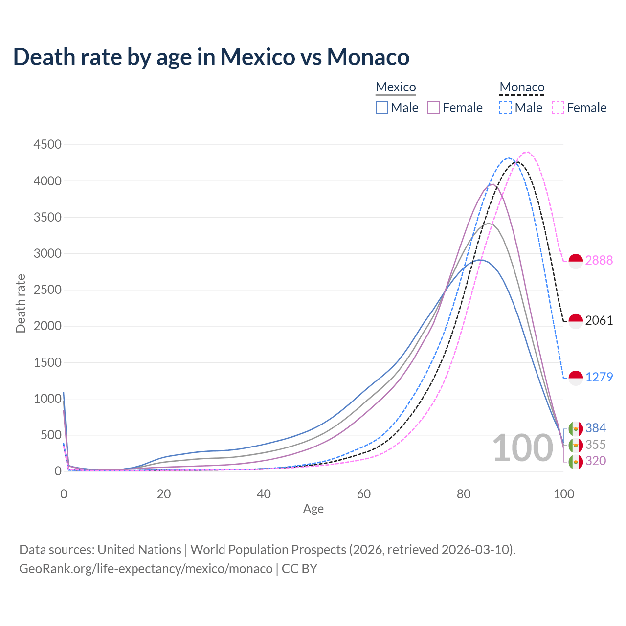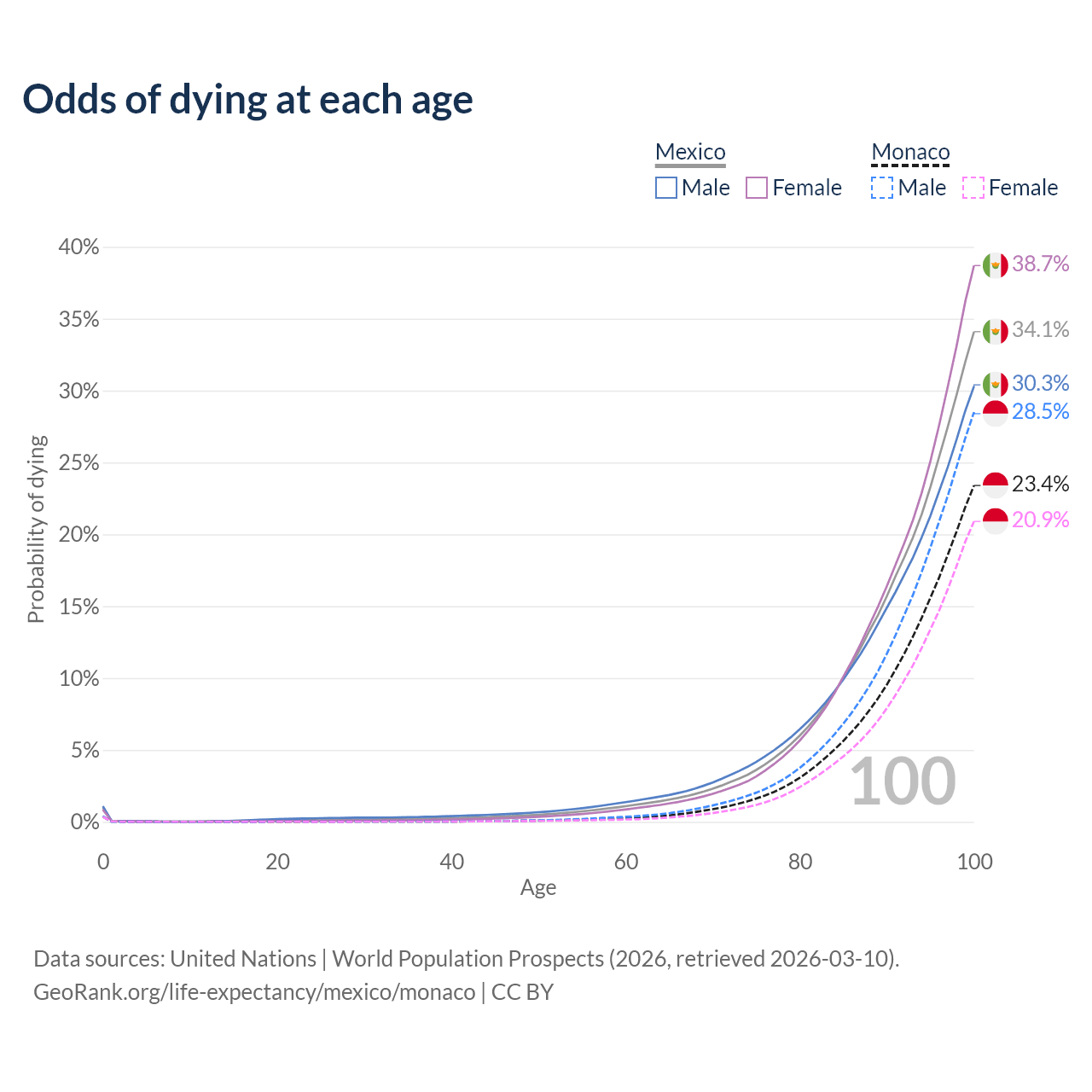 This life expectancy calculator shows the odds of living to 100, 95, 90, and below based on current age for both males and females in Mexico and Monaco, along with mean and median age of death. The calculations are based on the 2026 life tables (actuarial tables) from the UN World Population Prospects.