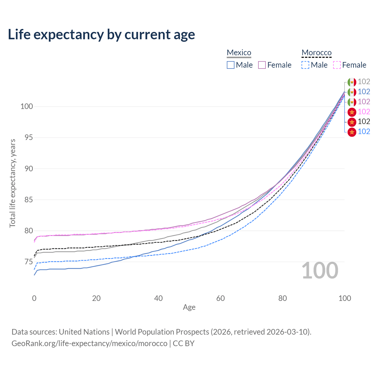 This life expectancy calculator shows the odds of living to 100, 95, 90, and below based on current age for both males and females in Mexico and Morocco, along with mean and median age of death. The calculations are based on the 2026 life tables (actuarial tables) from the UN World Population Prospects.