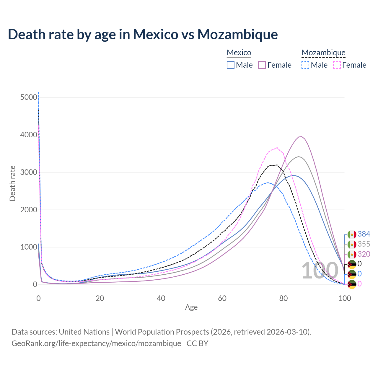 In Mexico, the most common age of death is 85, compared to 0 in Mozambique. The median age of death is 80.1 in Mexico and 71.2 in Mozambique, meaning only half of each cohort is expected to live past that age.