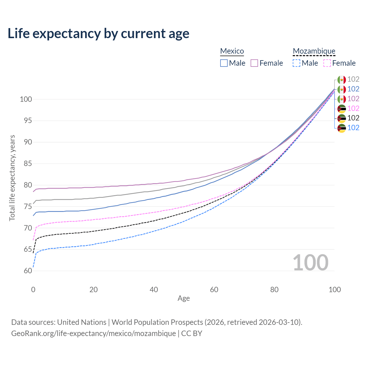 This life expectancy calculator shows the odds of living to 100, 95, 90, and below based on current age for both males and females in Mexico and Mozambique, along with mean and median age of death. The calculations are based on the 2026 life tables (actuarial tables) from the UN World Population Prospects.