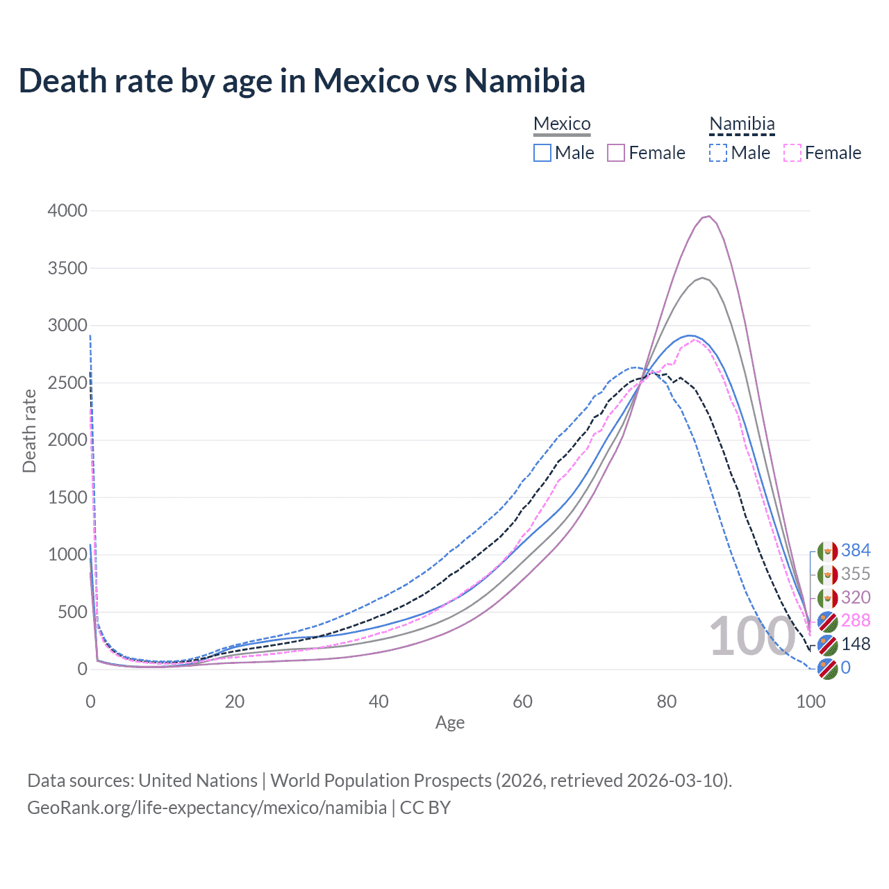 In Mexico, the most common age of death is 85, compared to 0 in Namibia. The median age of death is 80.1 in Mexico and 72.7 in Namibia, meaning only half of each cohort is expected to live past that age.