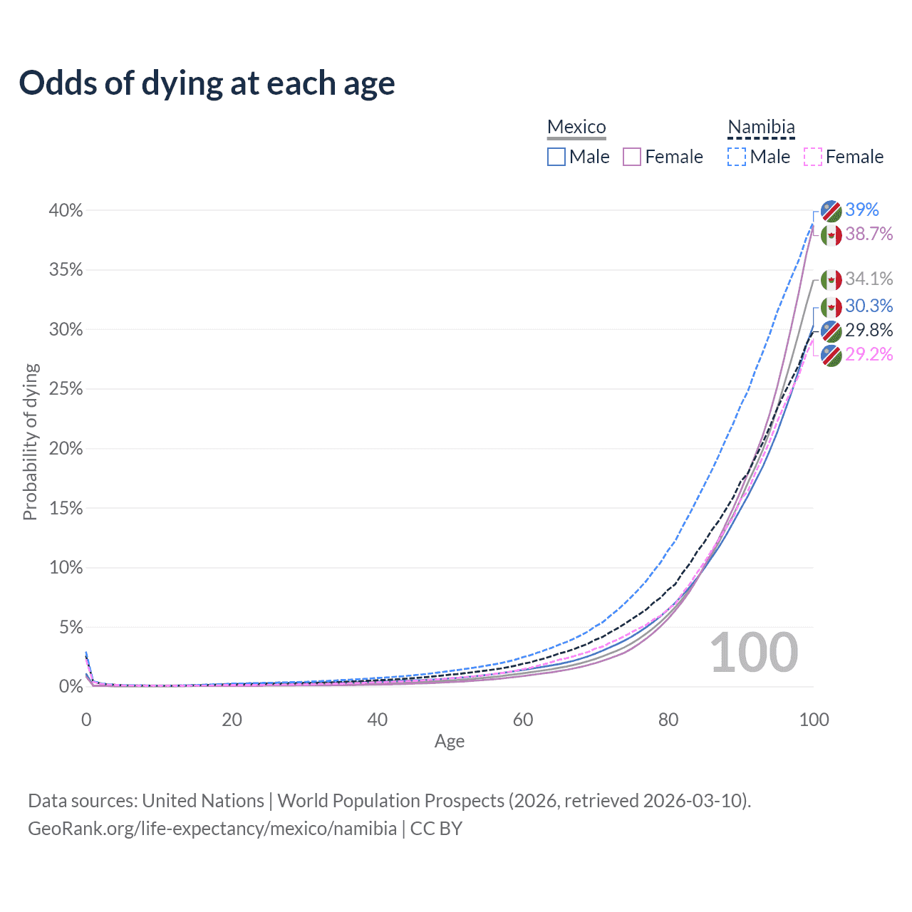 This life expectancy calculator shows the odds of living to 100, 95, 90, and below based on current age for both males and females in Mexico and Namibia, along with mean and median age of death. The calculations are based on the 2026 life tables (actuarial tables) from the UN World Population Prospects.