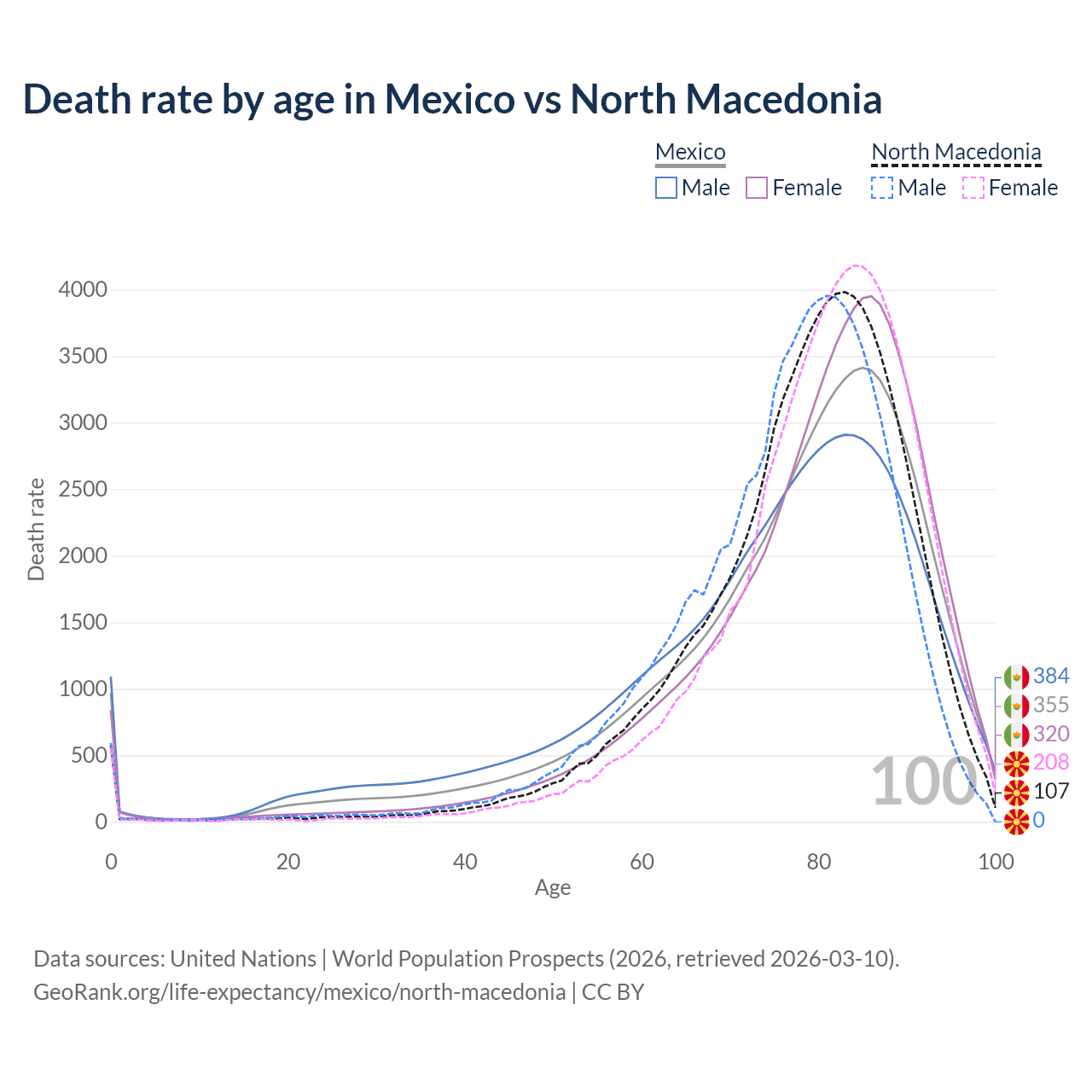In Mexico, the most common age of death is 85, compared to 83 in North Macedonia. The median age of death is 80.1 in Mexico and 80.3 in North Macedonia, meaning only half of each cohort is expected to live past that age.