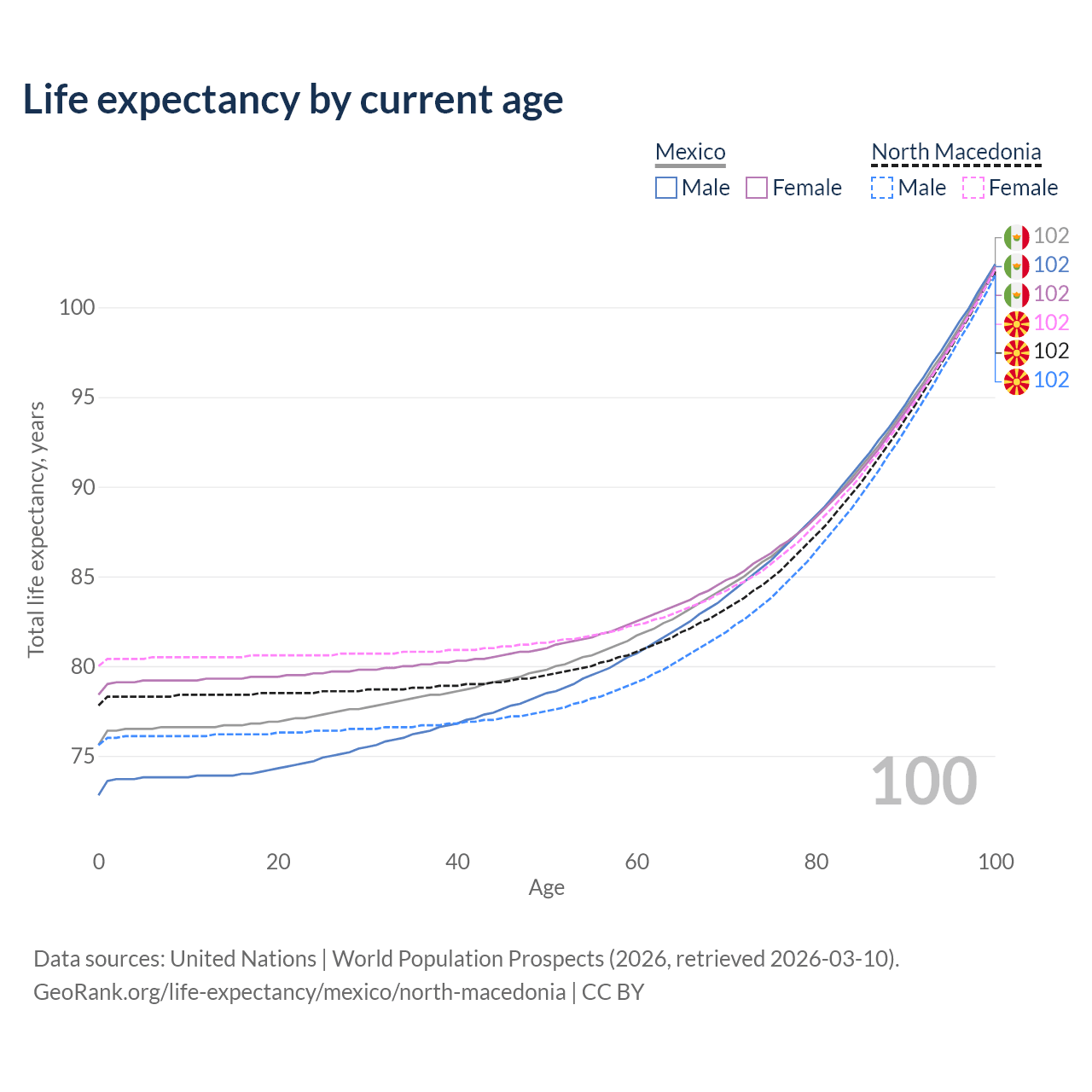 This life expectancy calculator shows the odds of living to 100, 95, 90, and below based on current age for both males and females in Mexico and North Macedonia, along with mean and median age of death. The calculations are based on the 2026 life tables (actuarial tables) from the UN World Population Prospects.