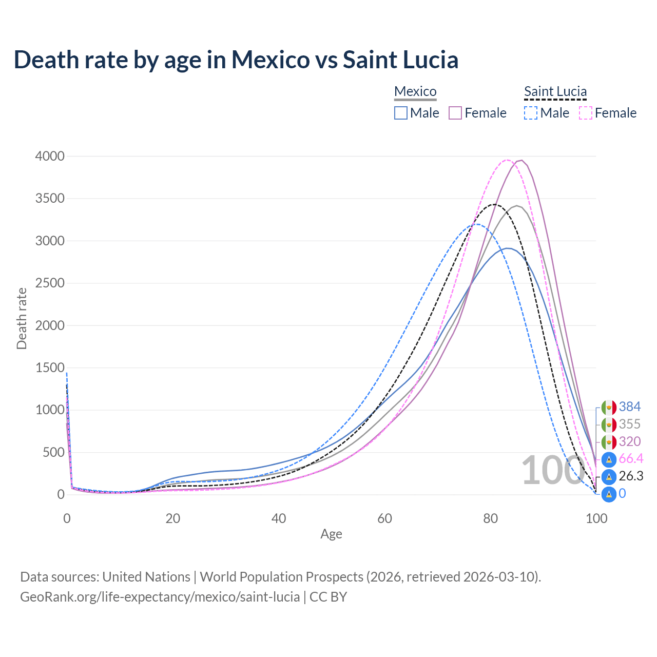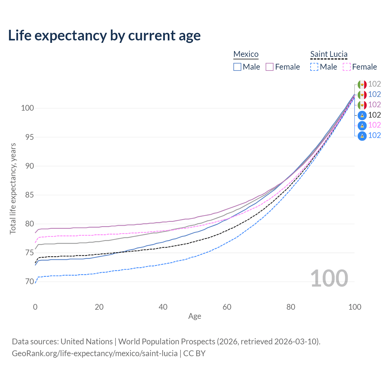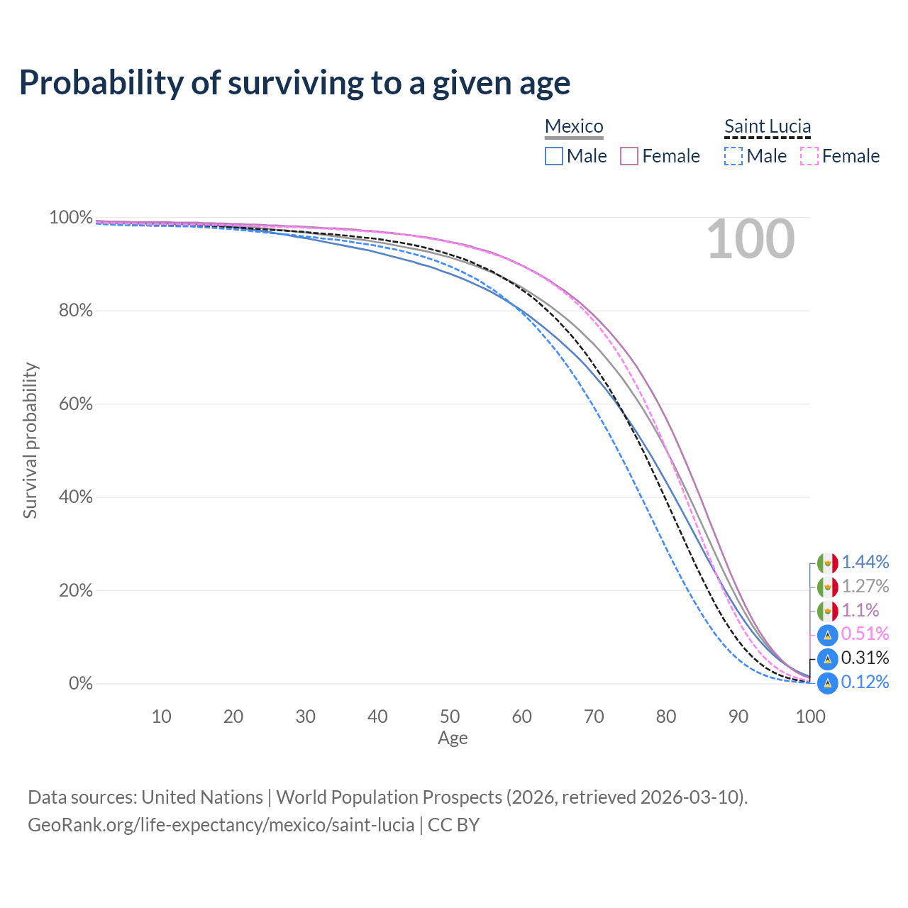 This life expectancy calculator shows the odds of living to 100, 95, 90, and below based on current age for both males and females in Mexico and Saint Lucia, along with mean and median age of death. The calculations are based on the 2026 life tables (actuarial tables) from the UN World Population Prospects.