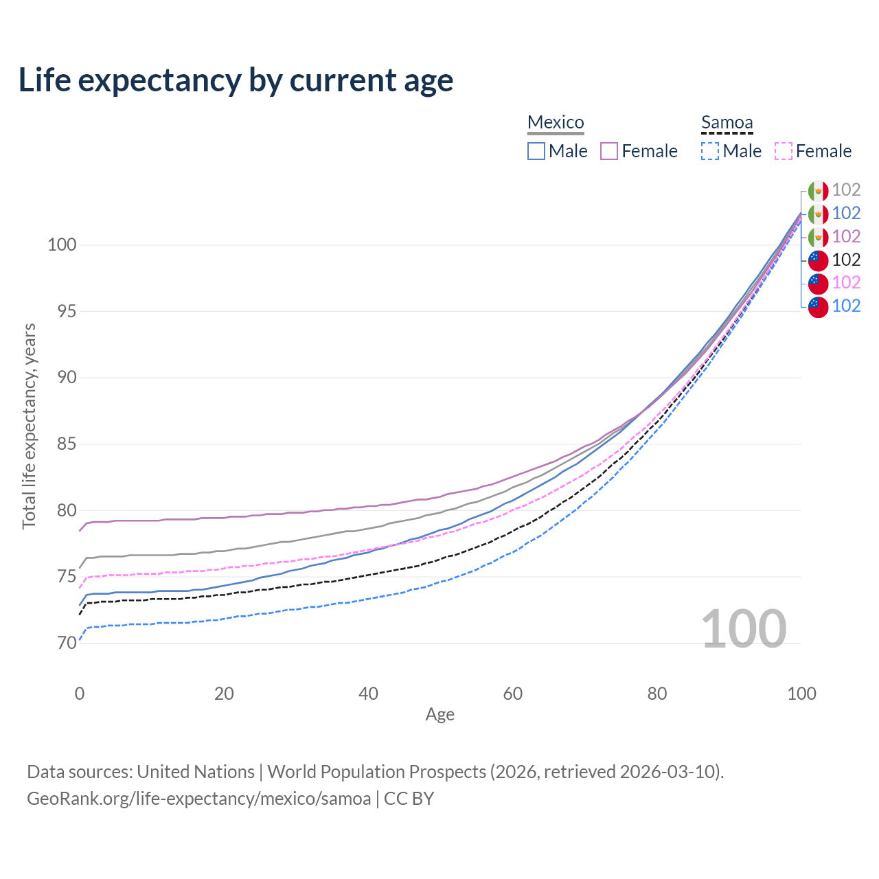 This life expectancy calculator shows the odds of living to 100, 95, 90, and below based on current age for both males and females in Mexico and Samoa, along with mean and median age of death. The calculations are based on the 2026 life tables (actuarial tables) from the UN World Population Prospects.