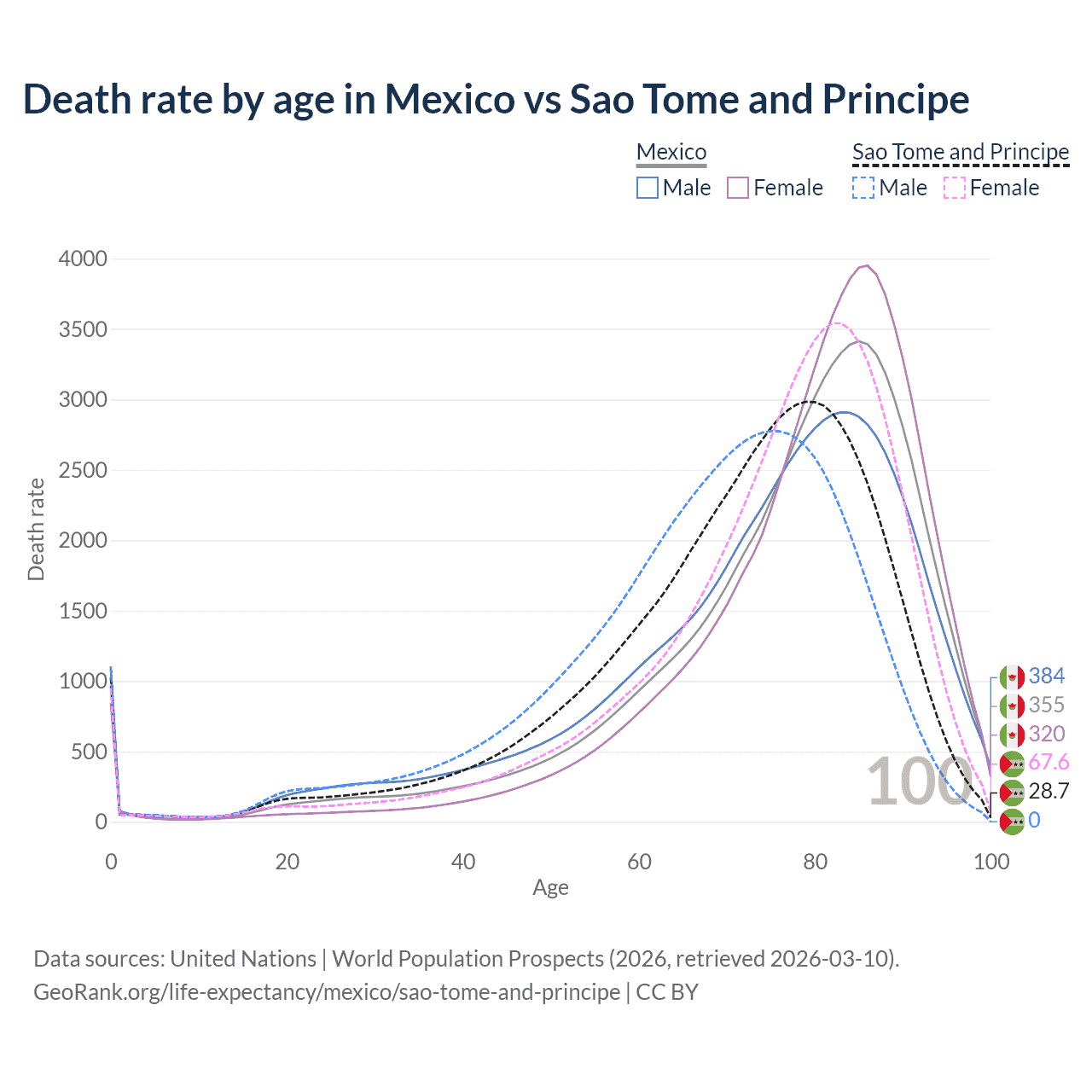 In Mexico, the most common age of death is 85, compared to 79 in Sao Tome and Principe. The median age of death is 80.1 in Mexico and 74.1 in Sao Tome and Principe, meaning only half of each cohort is expected to live past that age.