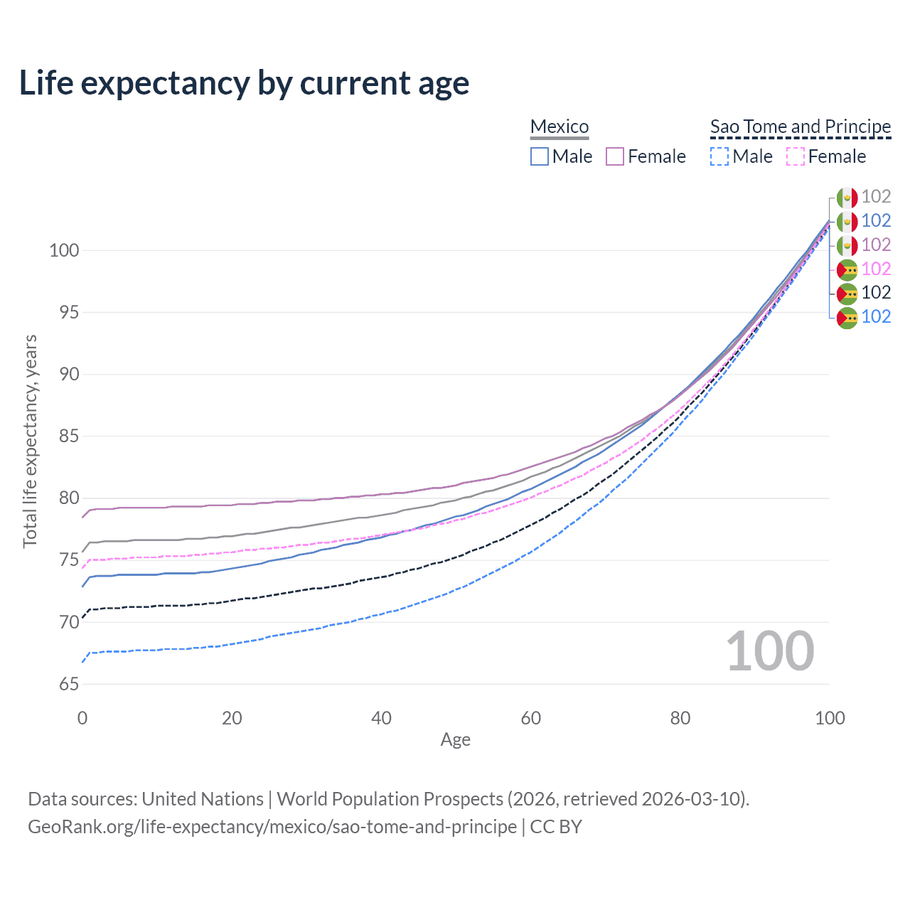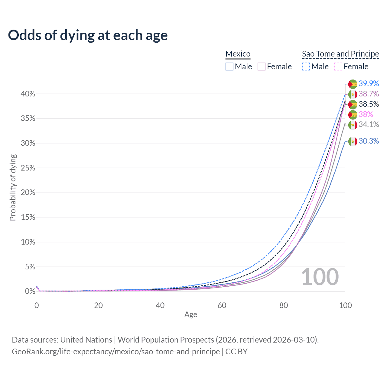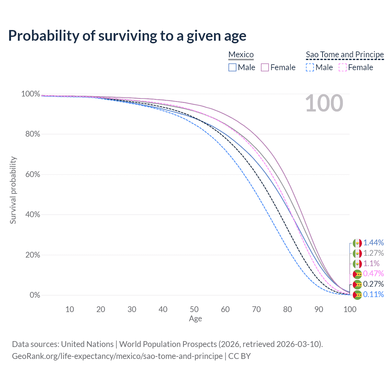 This life expectancy calculator shows the odds of living to 100, 95, 90, and below based on current age for both males and females in Mexico and Sao Tome and Principe, along with mean and median age of death. The calculations are based on the 2026 life tables (actuarial tables) from the UN World Population Prospects.