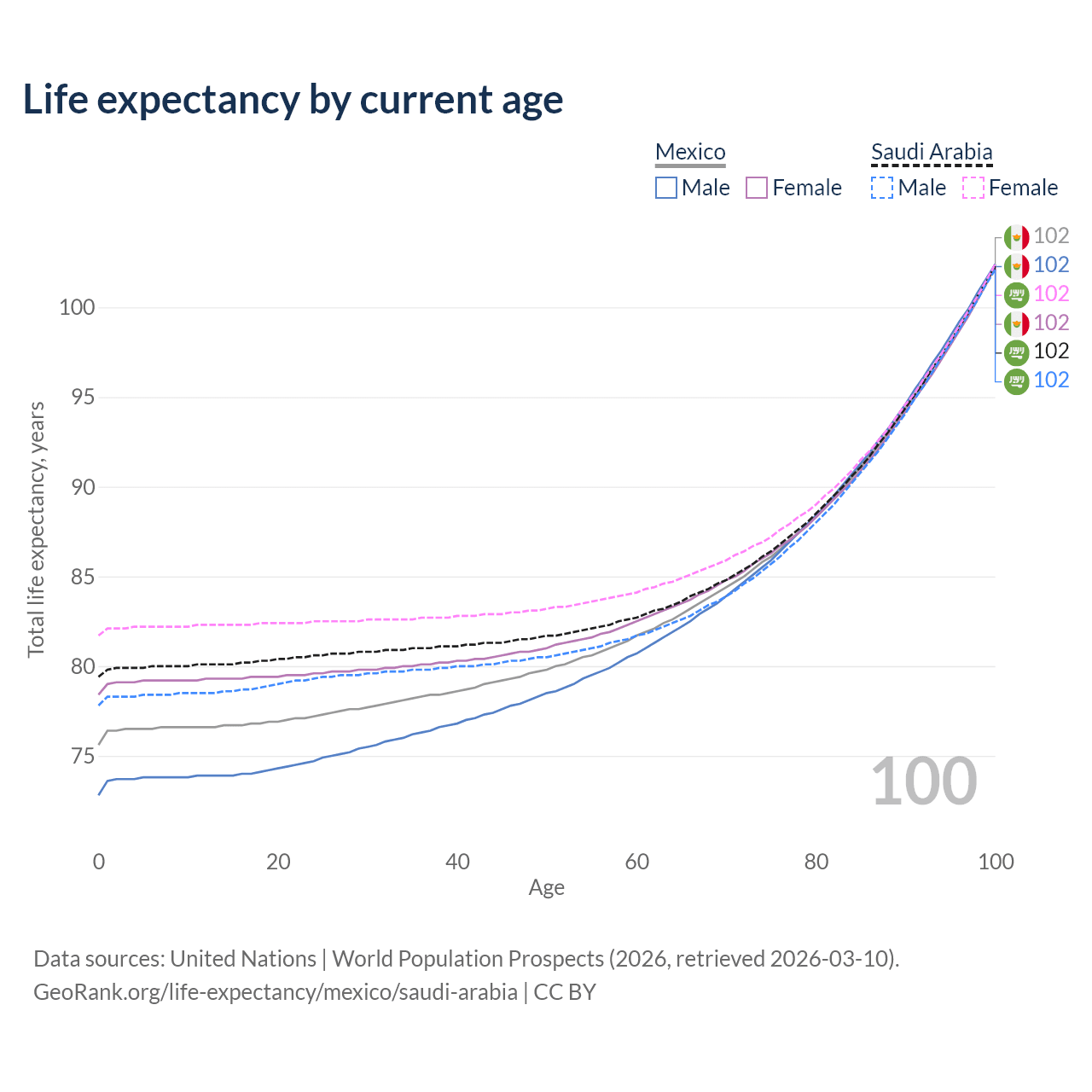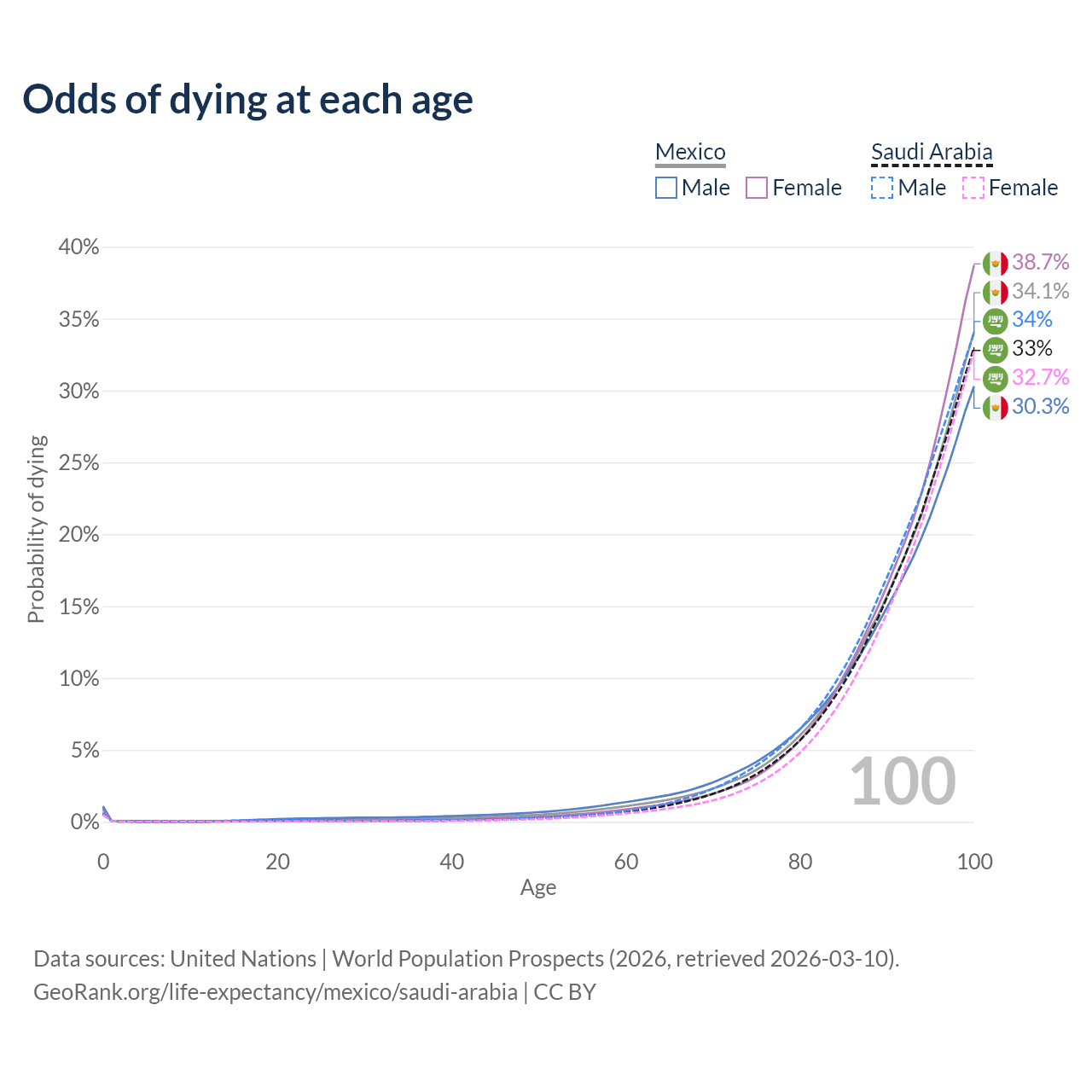This life expectancy calculator shows the odds of living to 100, 95, 90, and below based on current age for both males and females in Mexico and Saudi Arabia, along with mean and median age of death. The calculations are based on the 2026 life tables (actuarial tables) from the UN World Population Prospects.