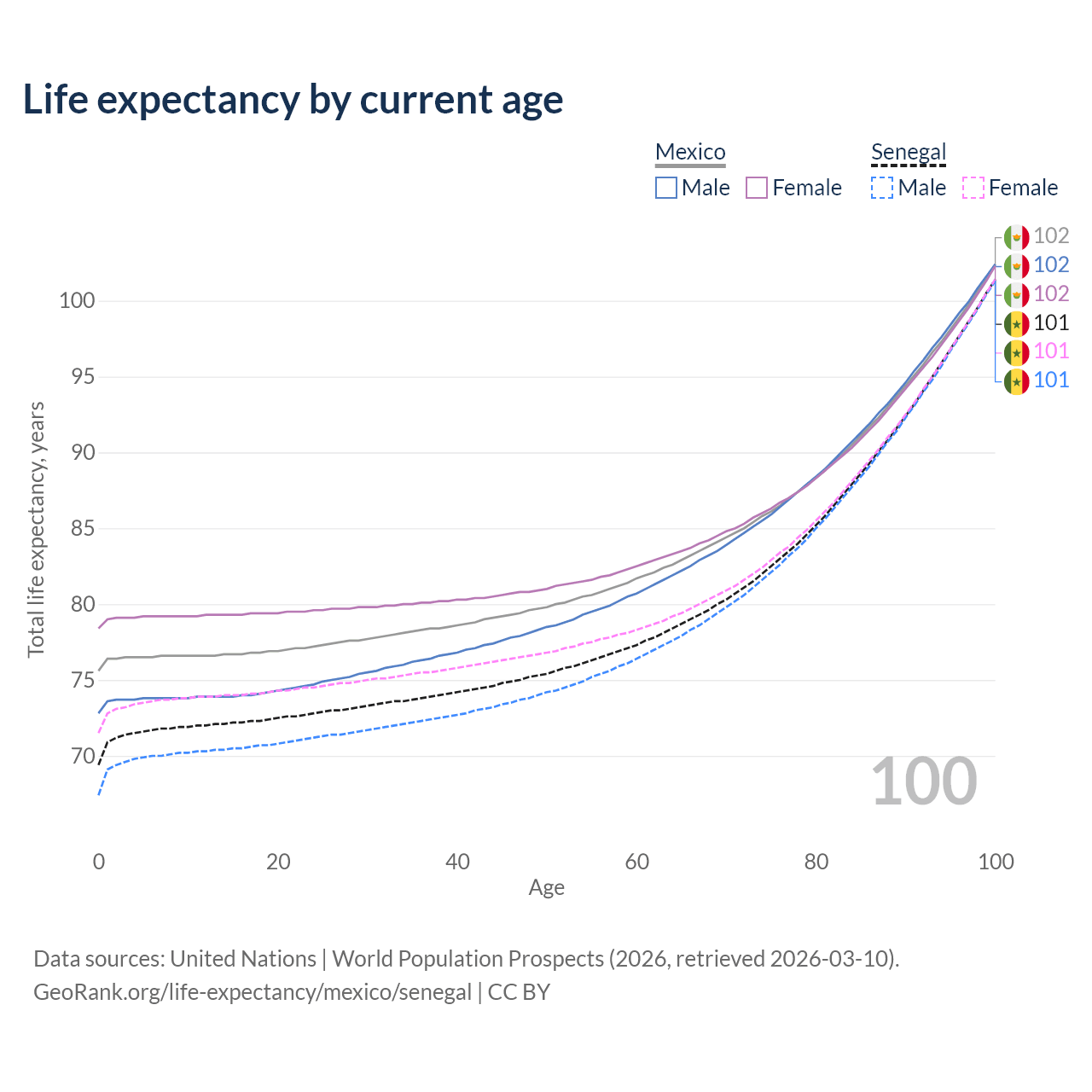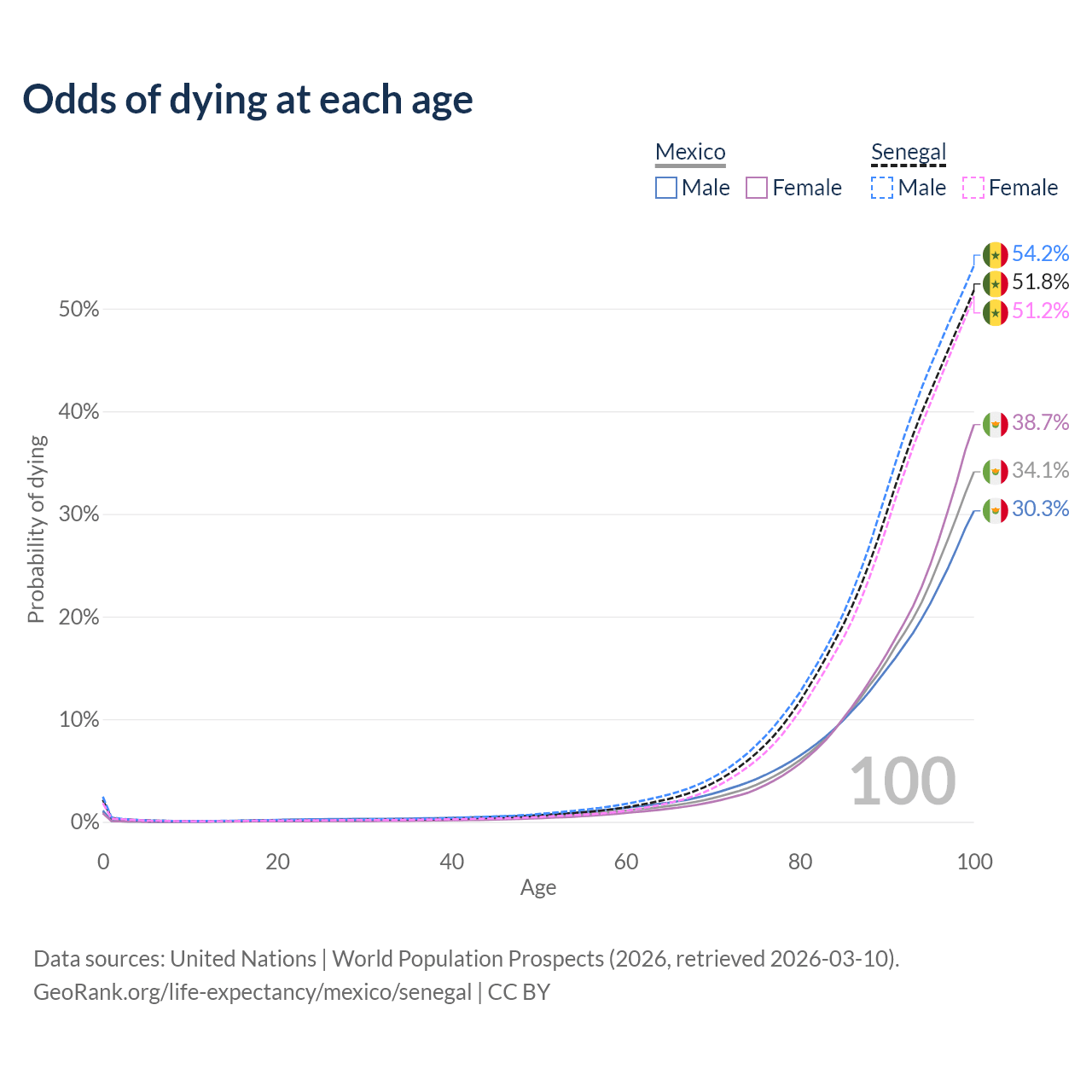 This life expectancy calculator shows the odds of living to 100, 95, 90, and below based on current age for both males and females in Mexico and Senegal, along with mean and median age of death. The calculations are based on the 2026 life tables (actuarial tables) from the UN World Population Prospects.