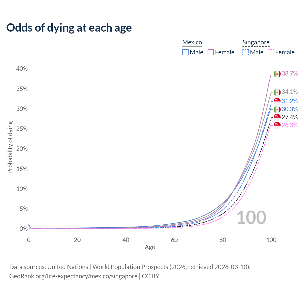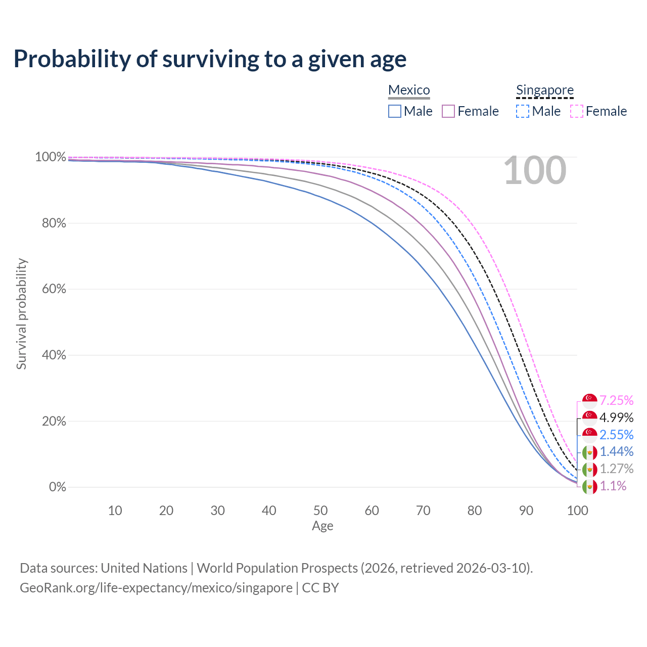 This life expectancy calculator shows the odds of living to 100, 95, 90, and below based on current age for both males and females in Mexico and Singapore, along with mean and median age of death. The calculations are based on the 2026 life tables (actuarial tables) from the UN World Population Prospects.