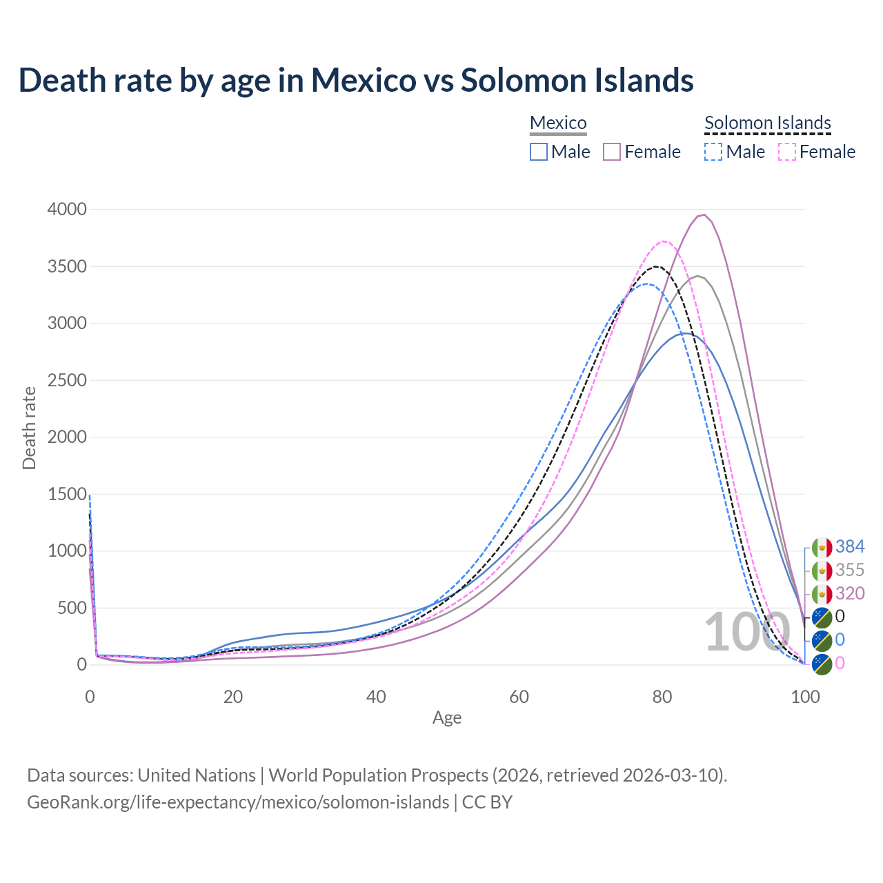 In Mexico, the most common age of death is 85, compared to 79 in the Solomon Islands. The median age of death is 80.1 in Mexico and 74.9 in the Solomon Islands, meaning only half of each cohort is expected to live past that age.