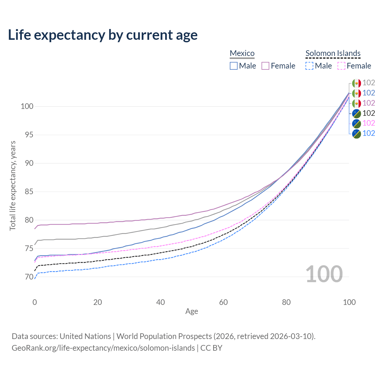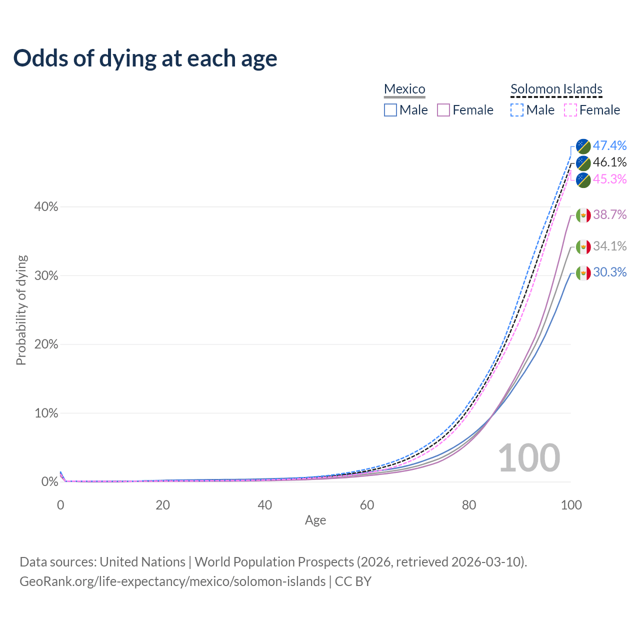 This life expectancy calculator shows the odds of living to 100, 95, 90, and below based on current age for both males and females in Mexico and the Solomon Islands, along with mean and median age of death. The calculations are based on the 2026 life tables (actuarial tables) from the UN World Population Prospects.