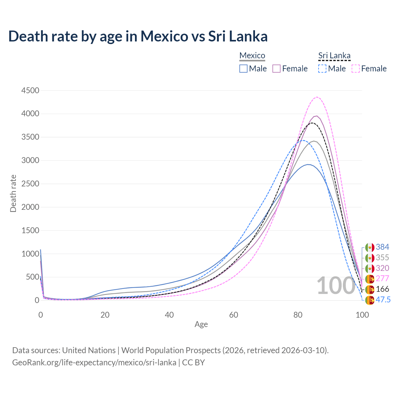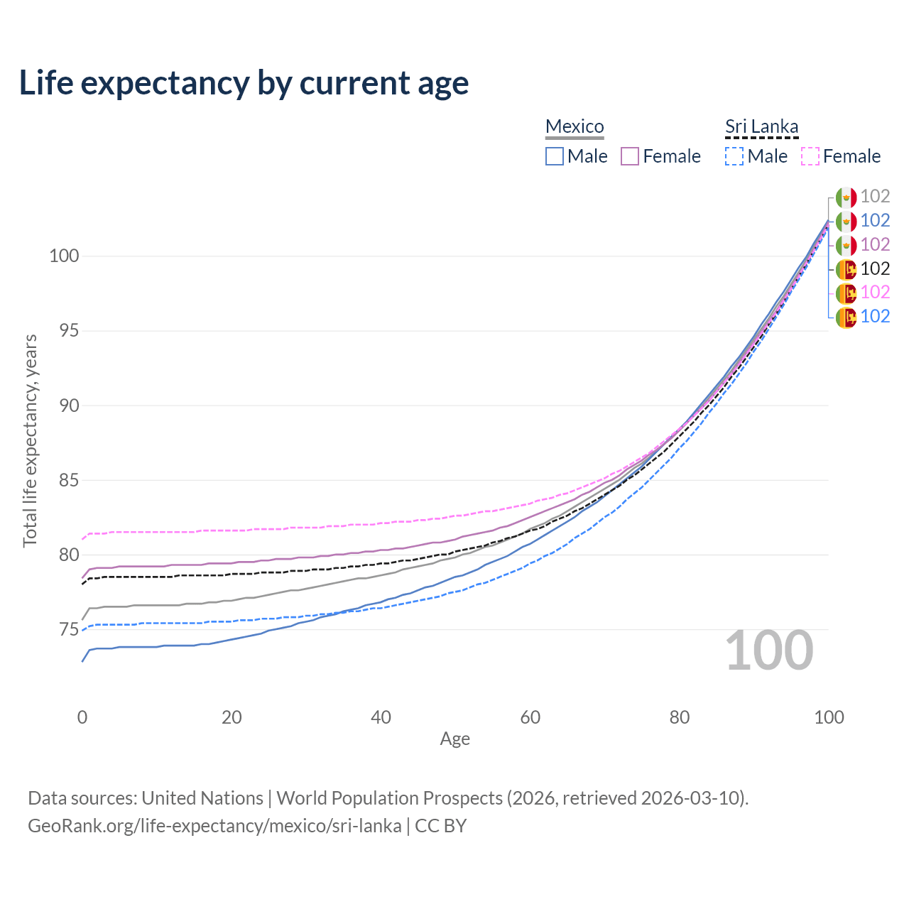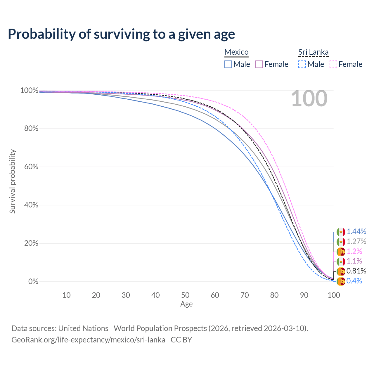 This life expectancy calculator shows the odds of living to 100, 95, 90, and below based on current age for both males and females in Mexico and Sri Lanka, along with mean and median age of death. The calculations are based on the 2026 life tables (actuarial tables) from the UN World Population Prospects.