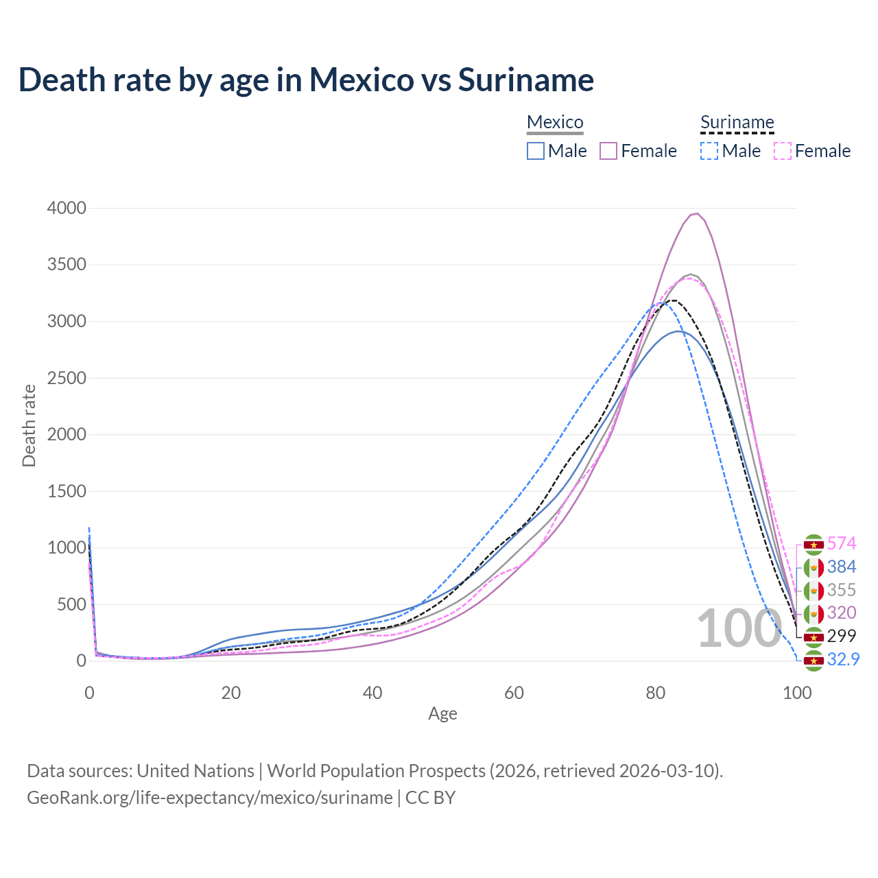 In Mexico, the most common age of death is 85, compared to 82 in Suriname. The median age of death is 80.1 in Mexico and 78 in Suriname, meaning only half of each cohort is expected to live past that age.