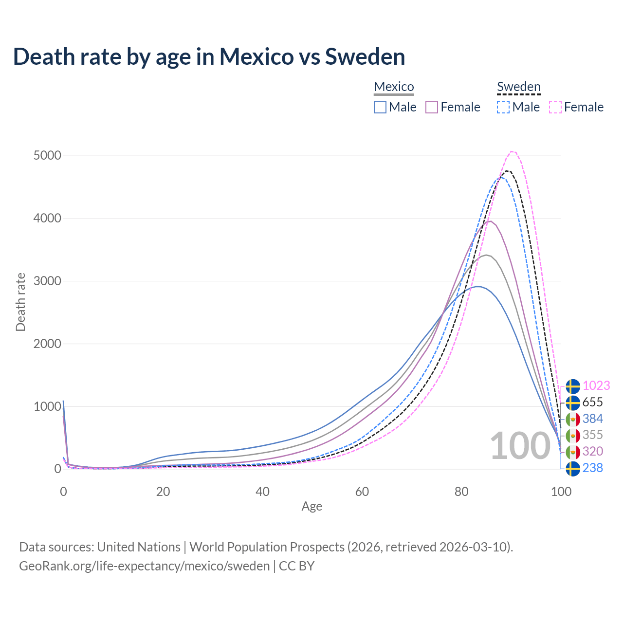 In Mexico, the most common age of death is 85, compared to 89 in Sweden. The median age of death is 80.1 in Mexico and 86.5 in Sweden, meaning only half of each cohort is expected to live past that age.