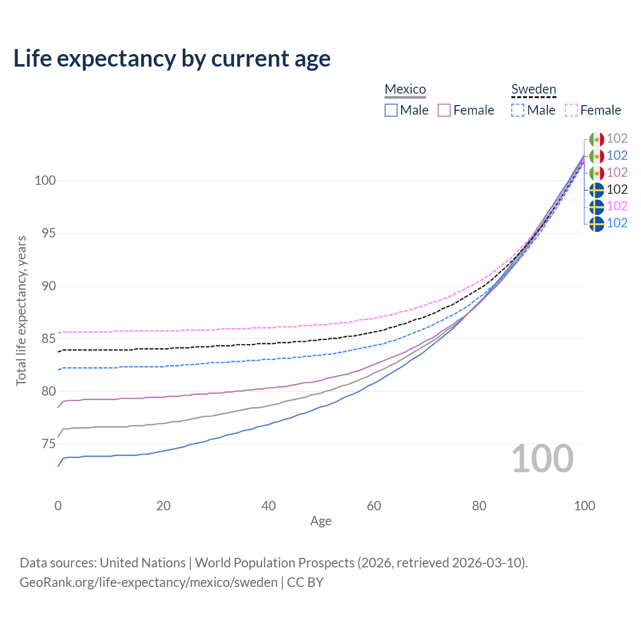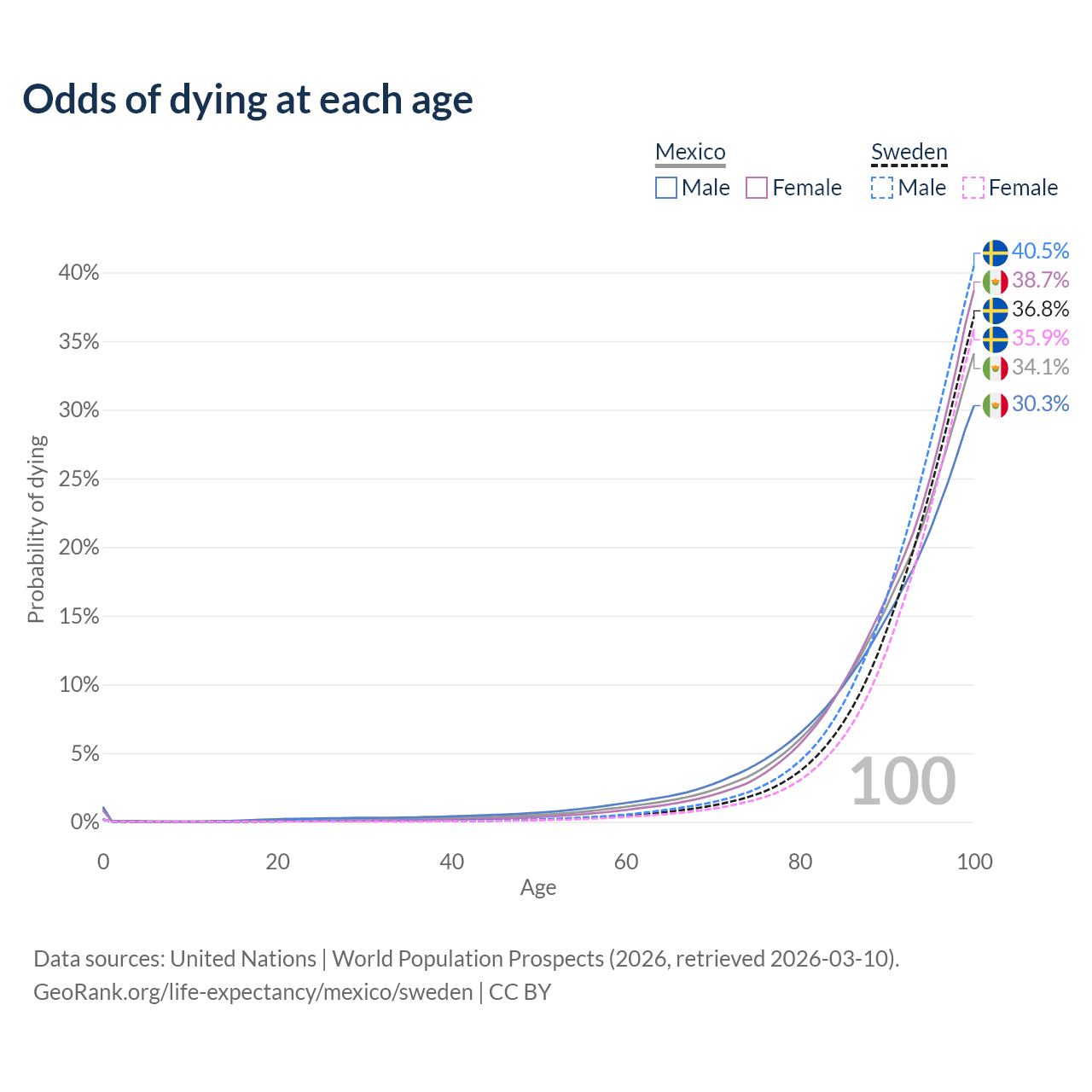 This life expectancy calculator shows the odds of living to 100, 95, 90, and below based on current age for both males and females in Mexico and Sweden, along with mean and median age of death. The calculations are based on the 2026 life tables (actuarial tables) from the UN World Population Prospects.