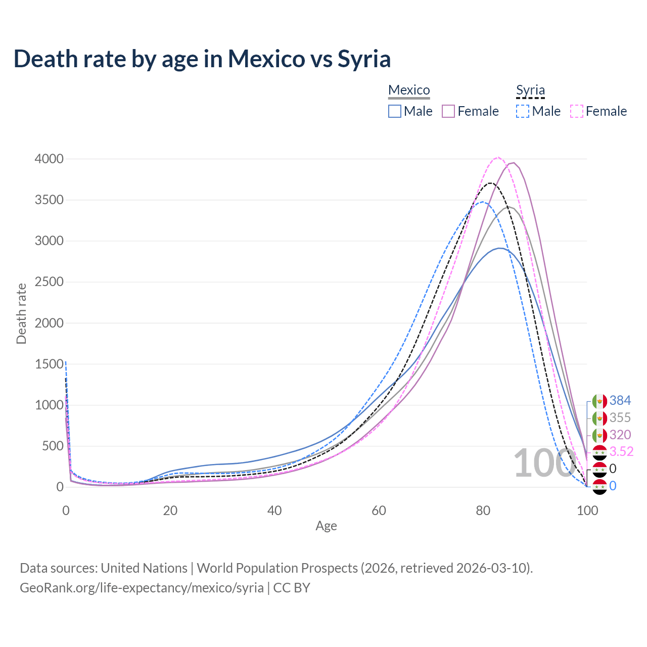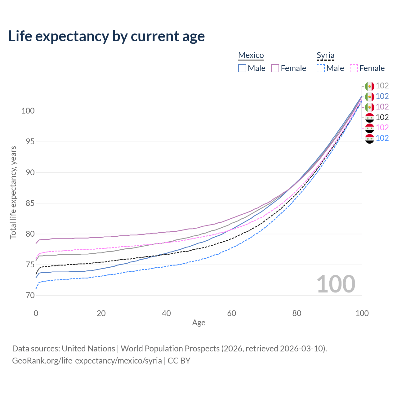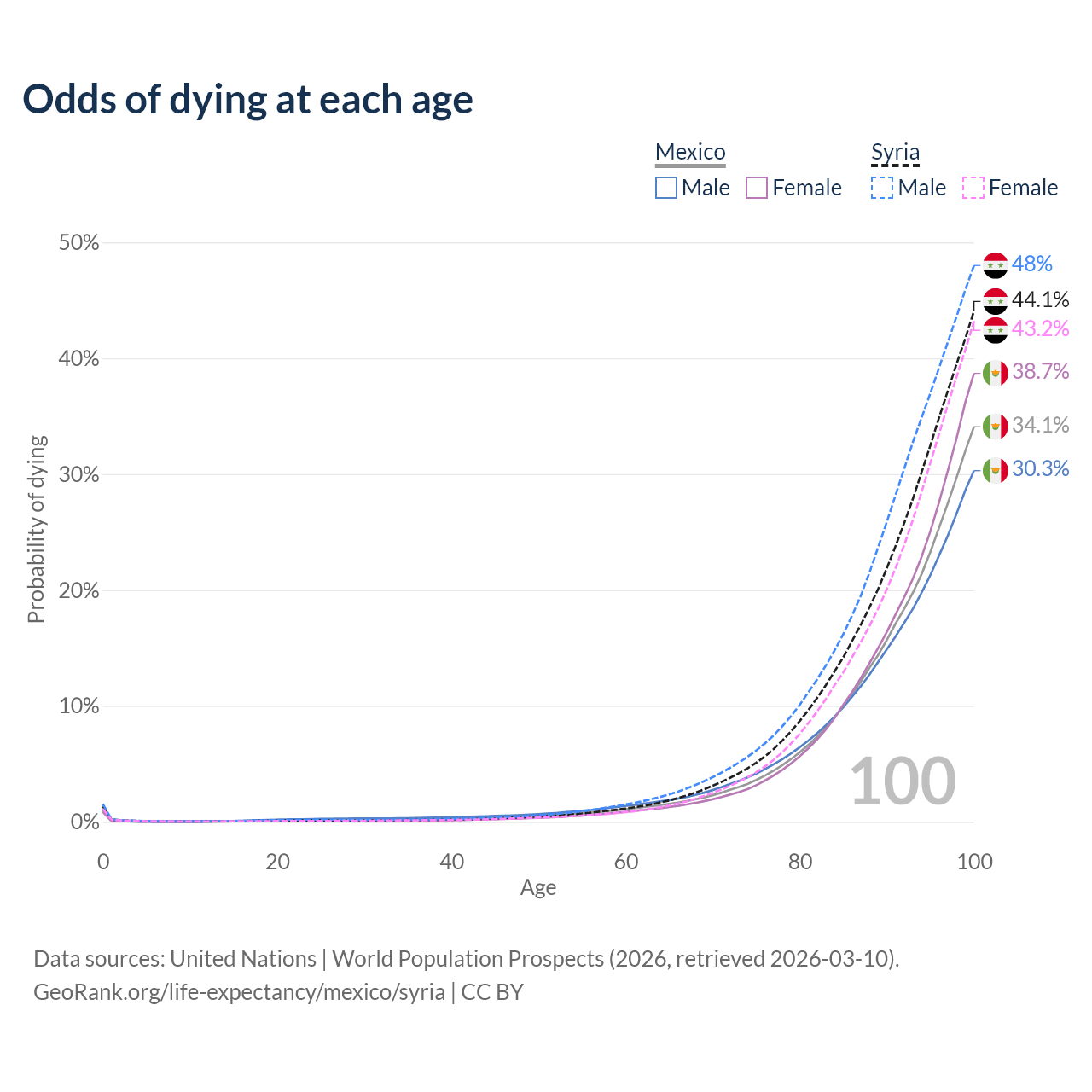 This life expectancy calculator shows the odds of living to 100, 95, 90, and below based on current age for both males and females in Mexico and Syria, along with mean and median age of death. The calculations are based on the 2026 life tables (actuarial tables) from the UN World Population Prospects.