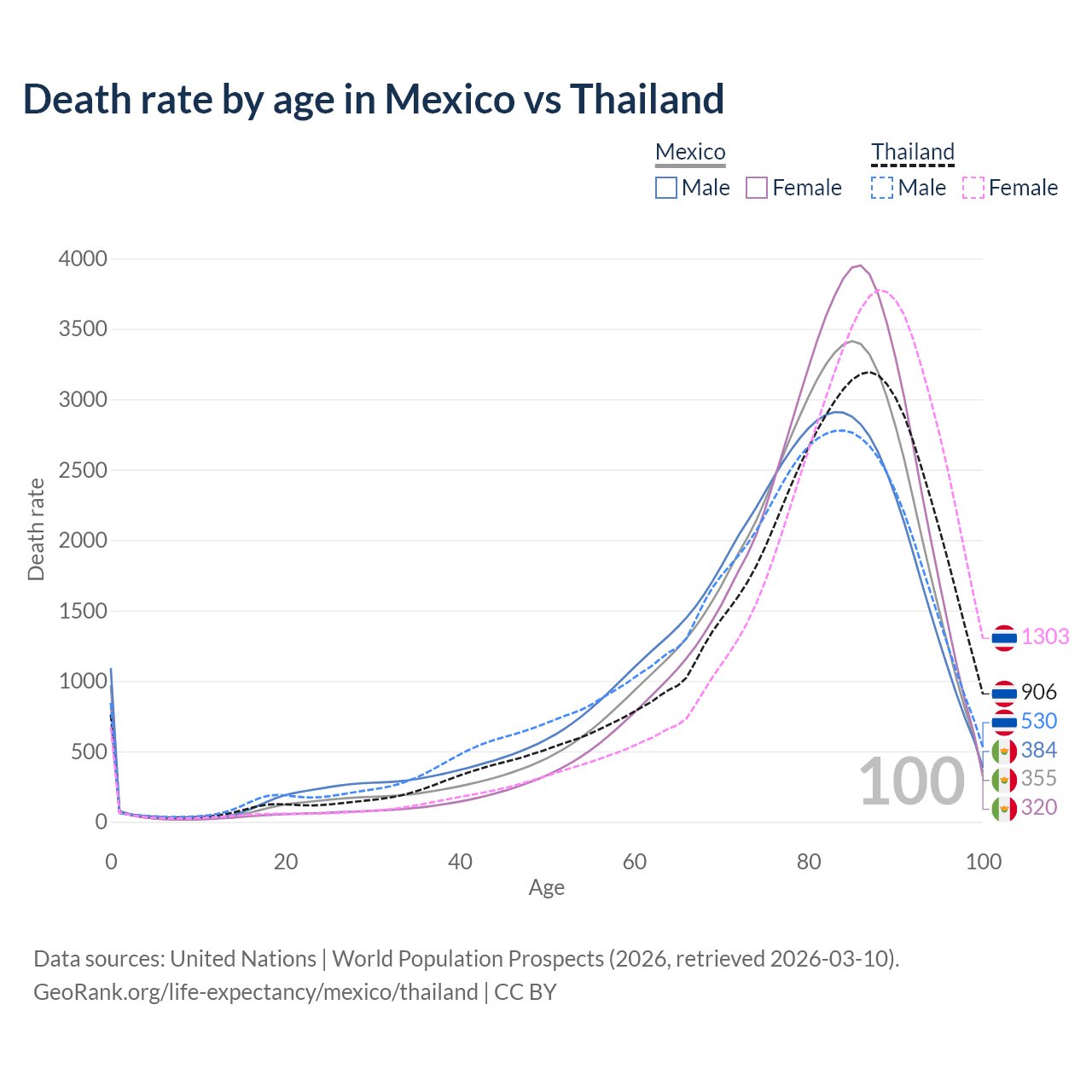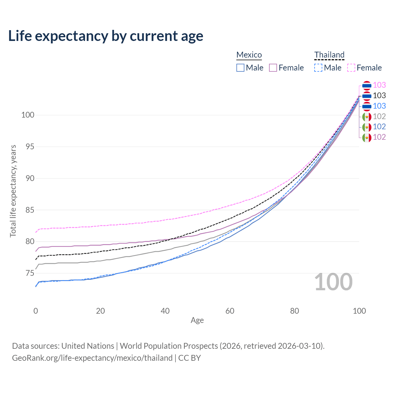 This life expectancy calculator shows the odds of living to 100, 95, 90, and below based on current age for both males and females in Mexico and Thailand, along with mean and median age of death. The calculations are based on the 2026 life tables (actuarial tables) from the UN World Population Prospects.