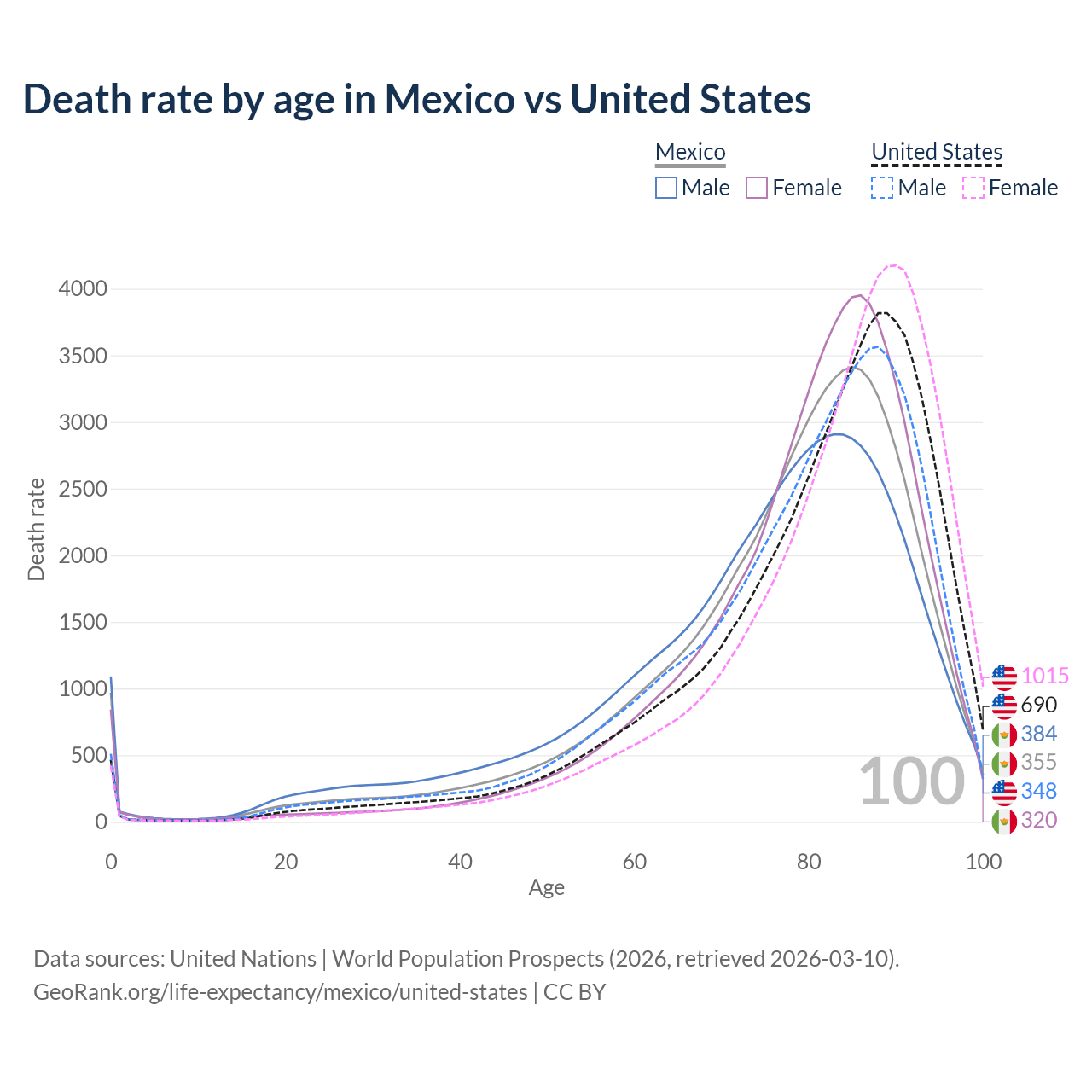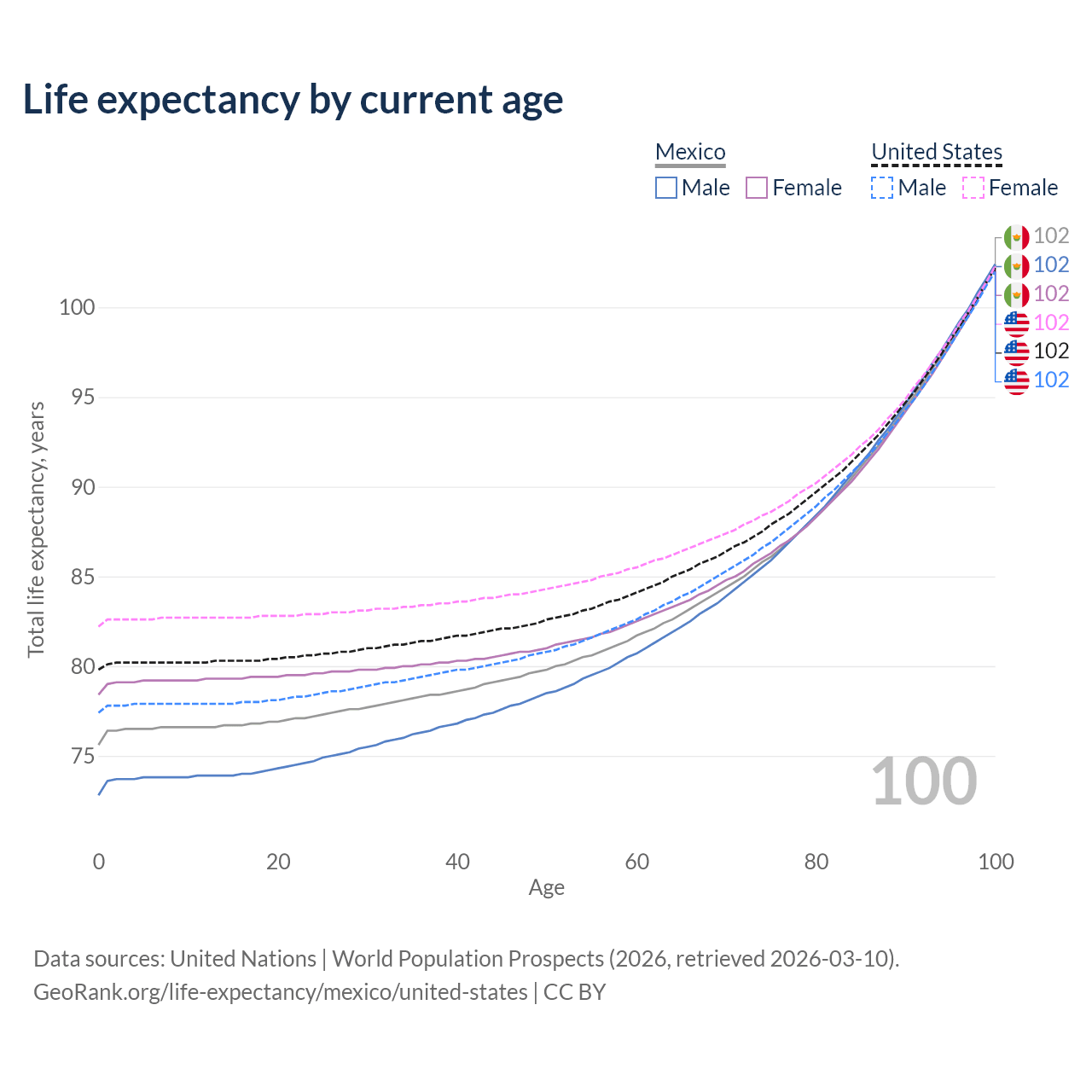 This life expectancy calculator shows the odds of living to 100, 95, 90, and below based on current age for both males and females in Mexico and the United States, along with mean and median age of death. The calculations are based on the 2026 life tables (actuarial tables) from the UN World Population Prospects.