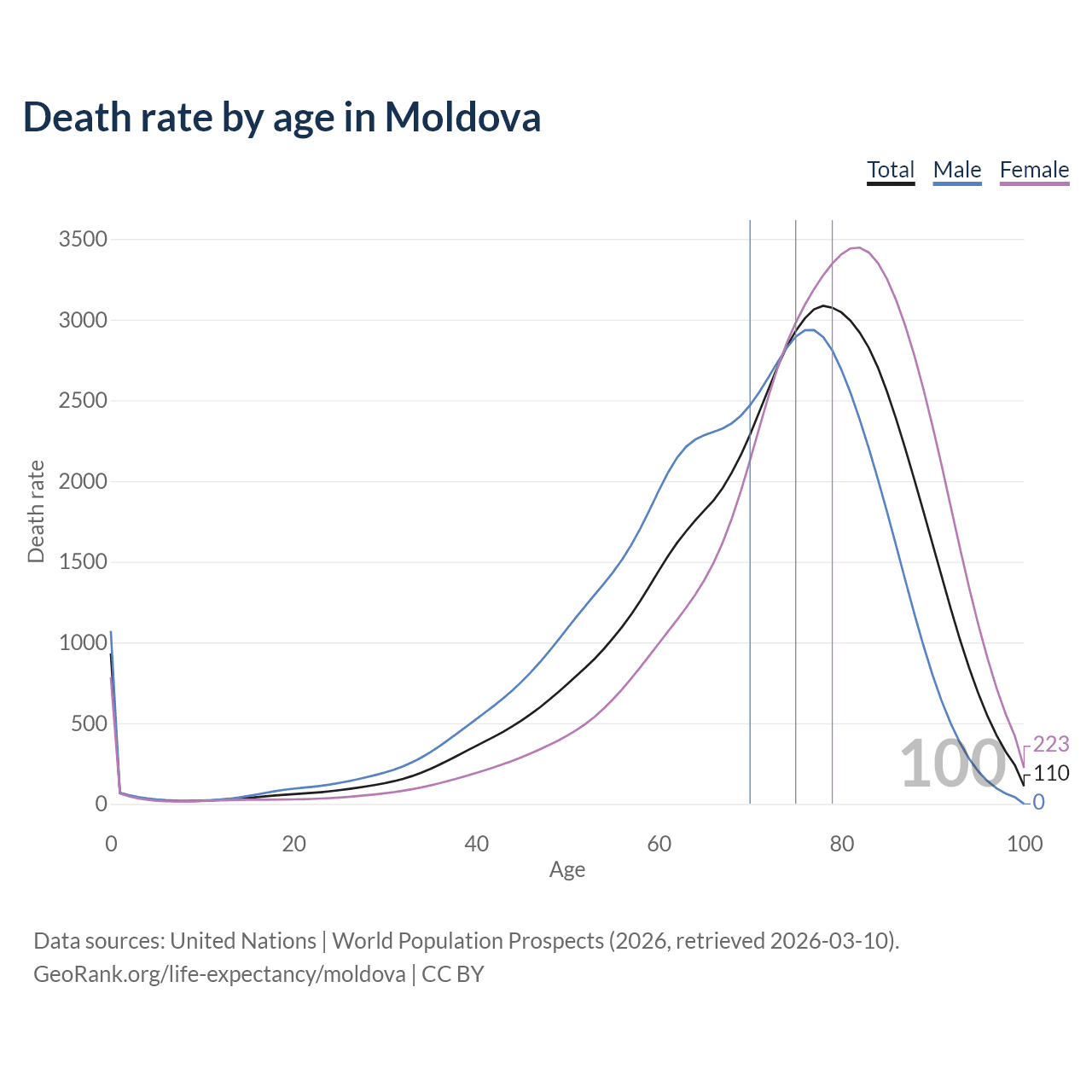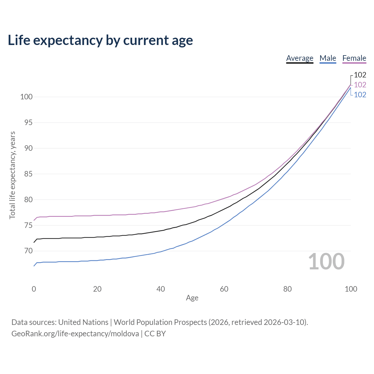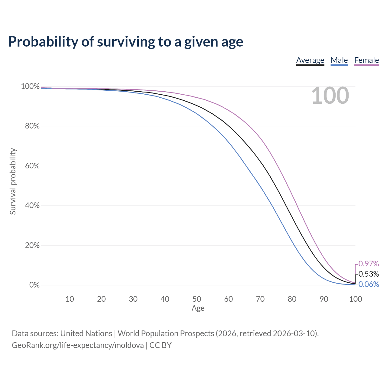 This life expectancy calculator shows the odds of living to 100, 95, 90, and below based on current age for both males and females in Moldova, along with mean and median age of death. The calculations are based on the 2026 life tables (actuarial tables) from the UN World Population Prospects.