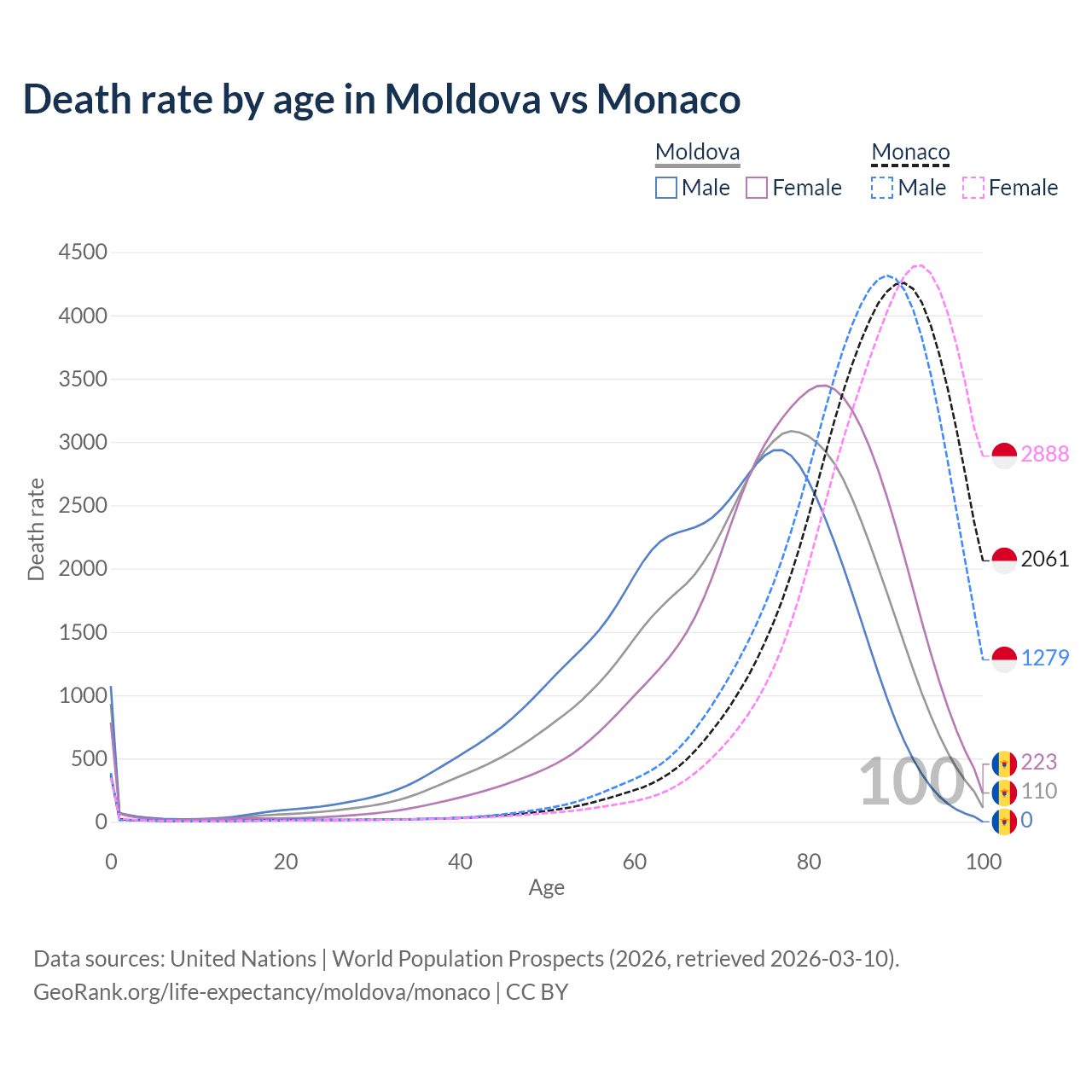 In Moldova, the most common age of death is 78, compared to 91 in Monaco. The median age of death is 74.8 in Moldova and 88.7 in Monaco, meaning only half of each cohort is expected to live past that age.