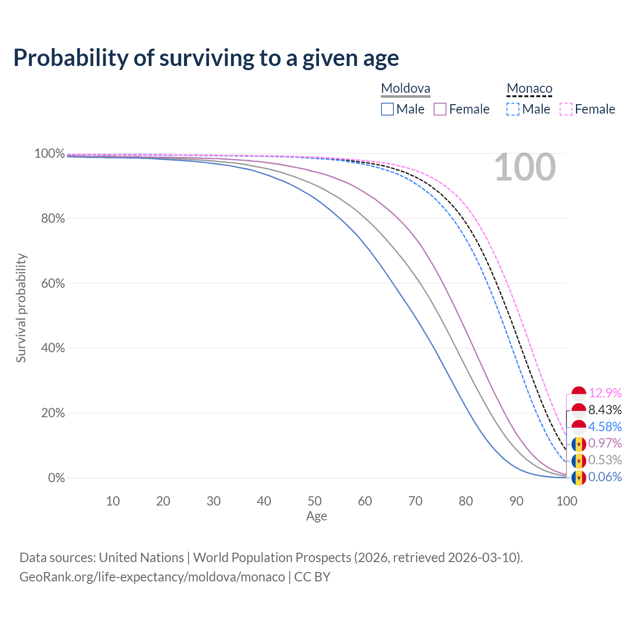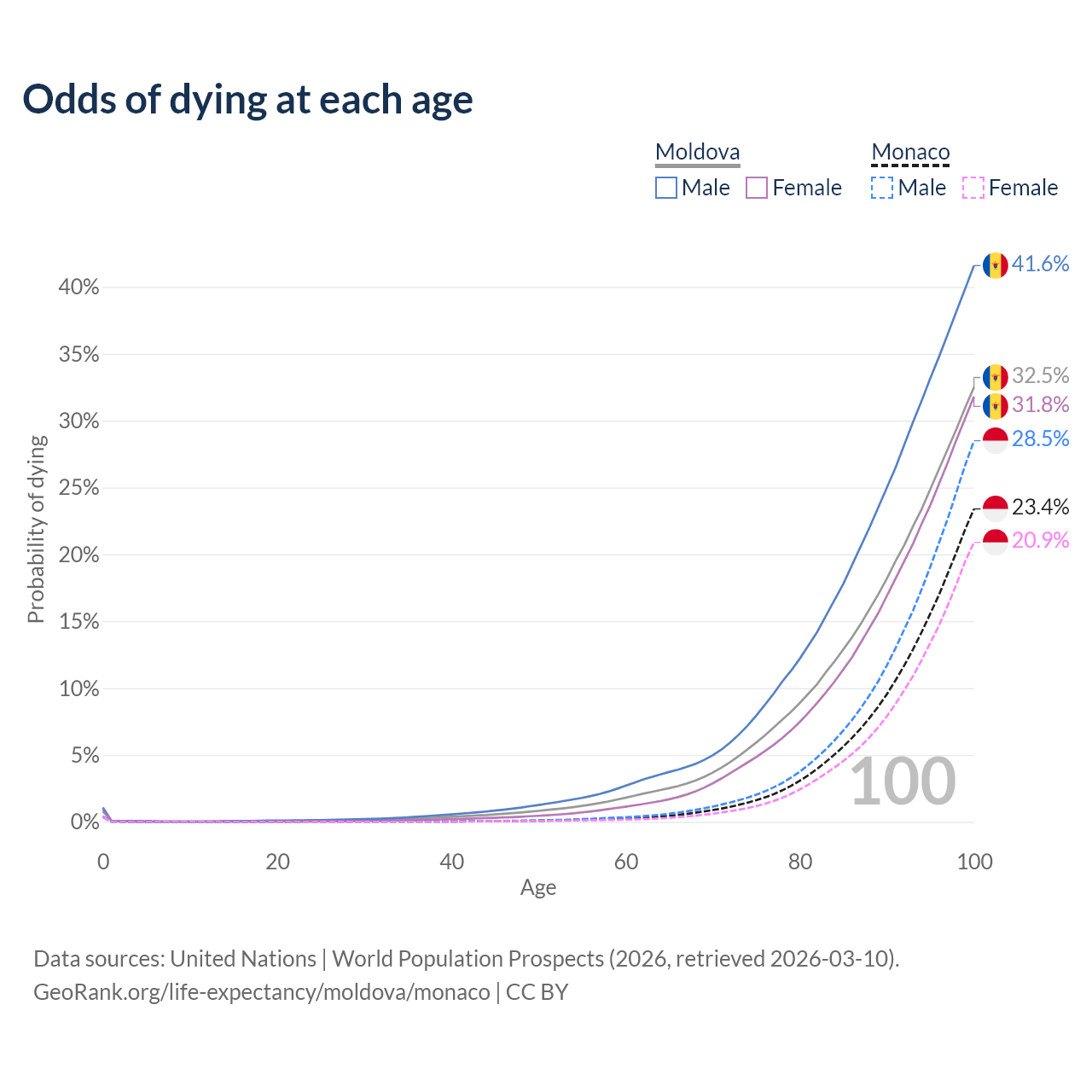 This life expectancy calculator shows the odds of living to 100, 95, 90, and below based on current age for both males and females in Moldova and Monaco, along with mean and median age of death. The calculations are based on the 2026 life tables (actuarial tables) from the UN World Population Prospects.
