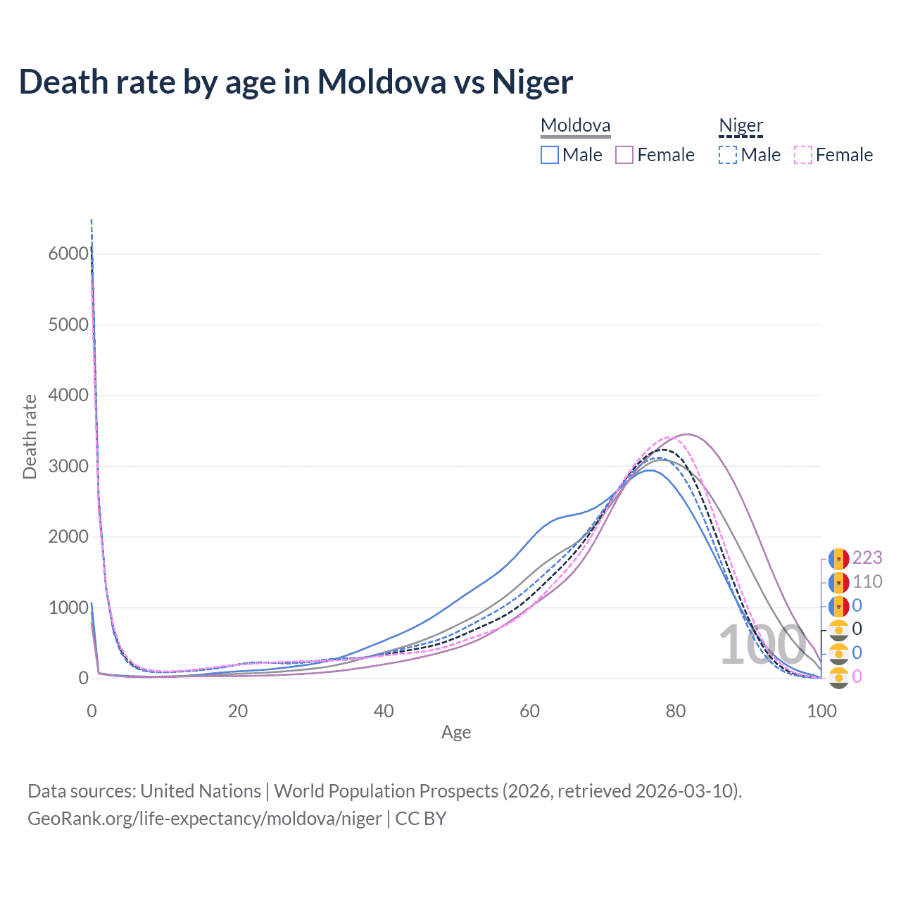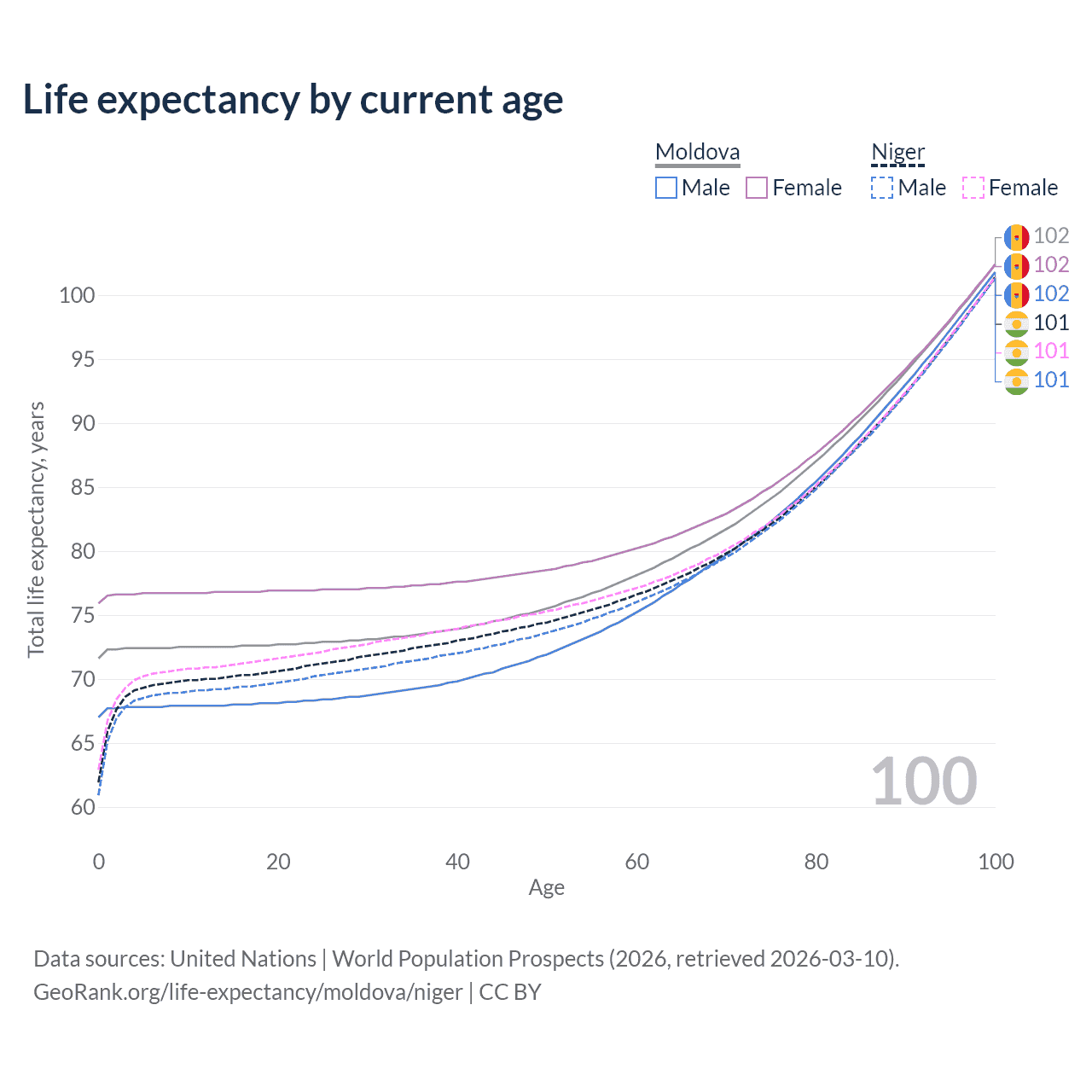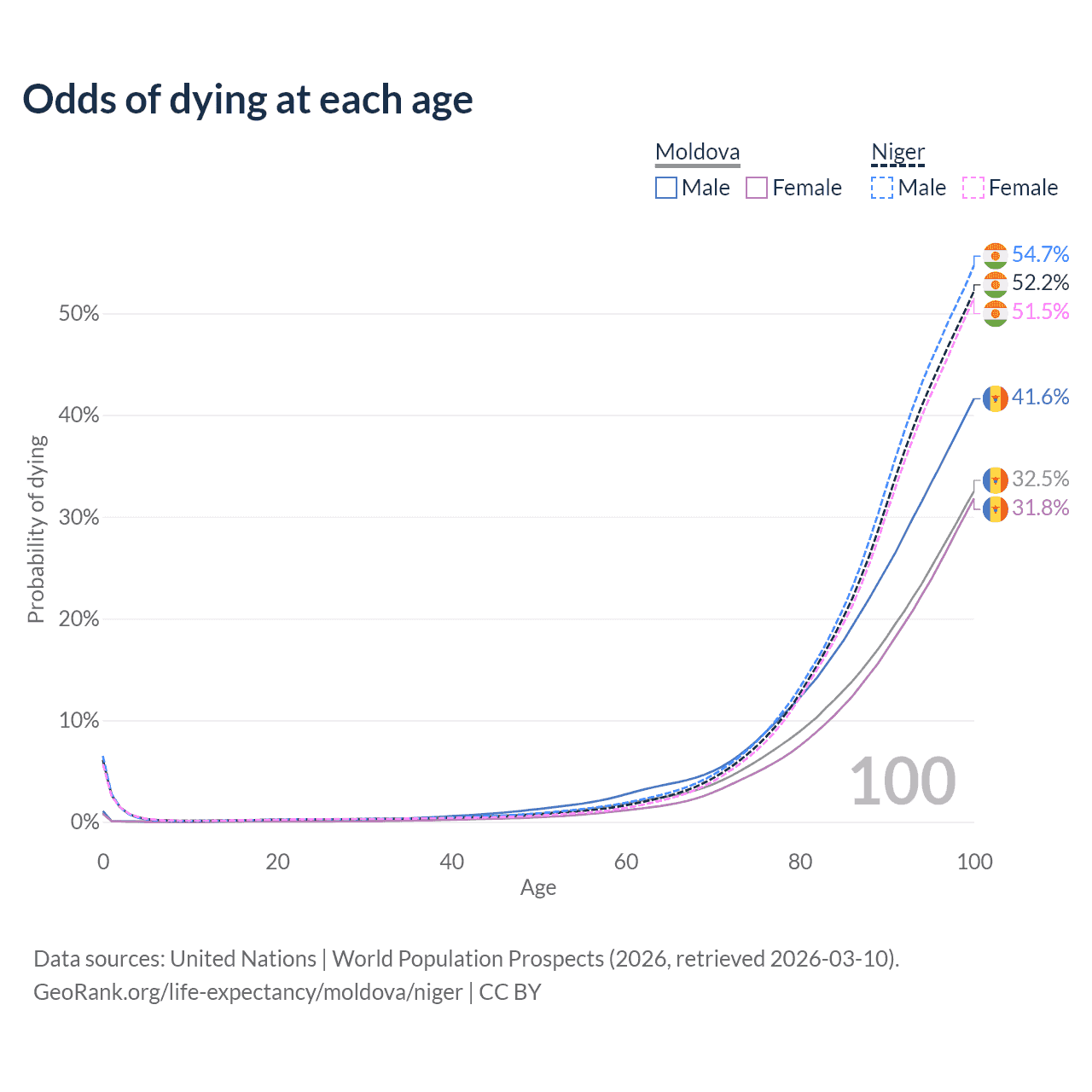 This life expectancy calculator shows the odds of living to 100, 95, 90, and below based on current age for both males and females in Moldova and Niger, along with mean and median age of death. The calculations are based on the 2026 life tables (actuarial tables) from the UN World Population Prospects.
