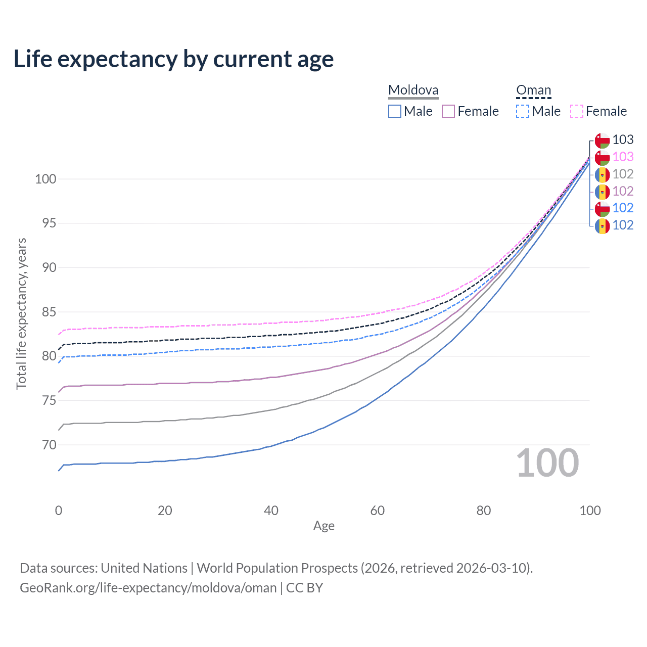 This life expectancy calculator shows the odds of living to 100, 95, 90, and below based on current age for both males and females in Moldova and Oman, along with mean and median age of death. The calculations are based on the 2026 life tables (actuarial tables) from the UN World Population Prospects.