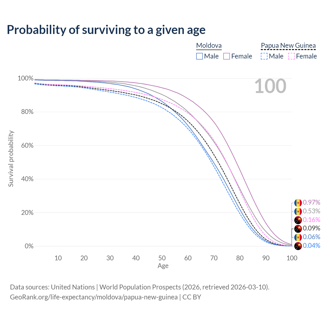 This life expectancy calculator shows the odds of living to 100, 95, 90, and below based on current age for both males and females in Moldova and Papua New Guinea, along with mean and median age of death. The calculations are based on the 2026 life tables (actuarial tables) from the UN World Population Prospects.