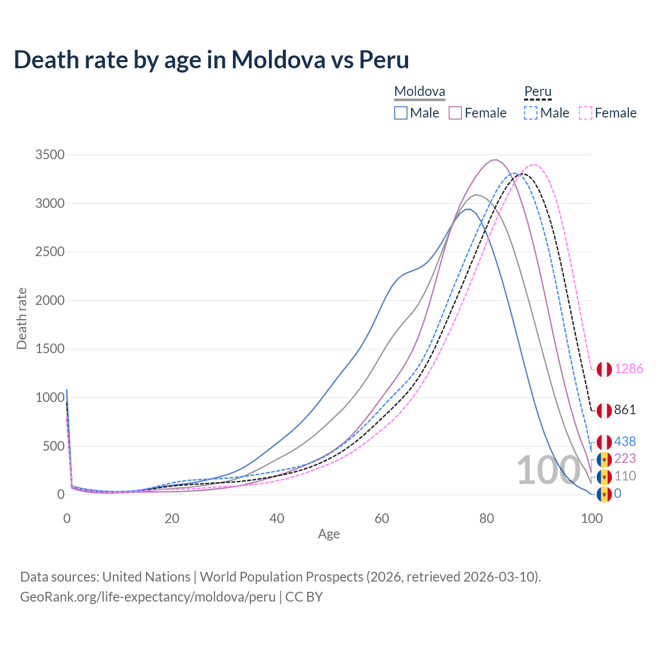 In Moldova, the most common age of death is 78, compared to 87 in Peru. The median age of death is 74.8 in Moldova and 82.4 in Peru, meaning only half of each cohort is expected to live past that age.