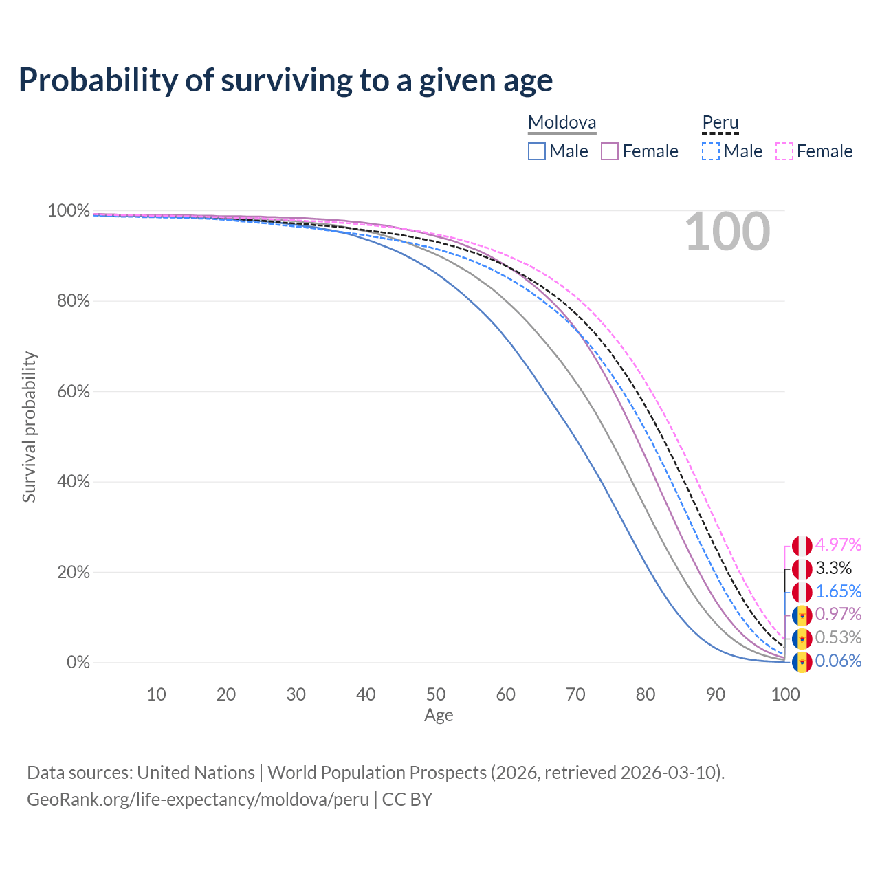 This life expectancy calculator shows the odds of living to 100, 95, 90, and below based on current age for both males and females in Moldova and Peru, along with mean and median age of death. The calculations are based on the 2026 life tables (actuarial tables) from the UN World Population Prospects.