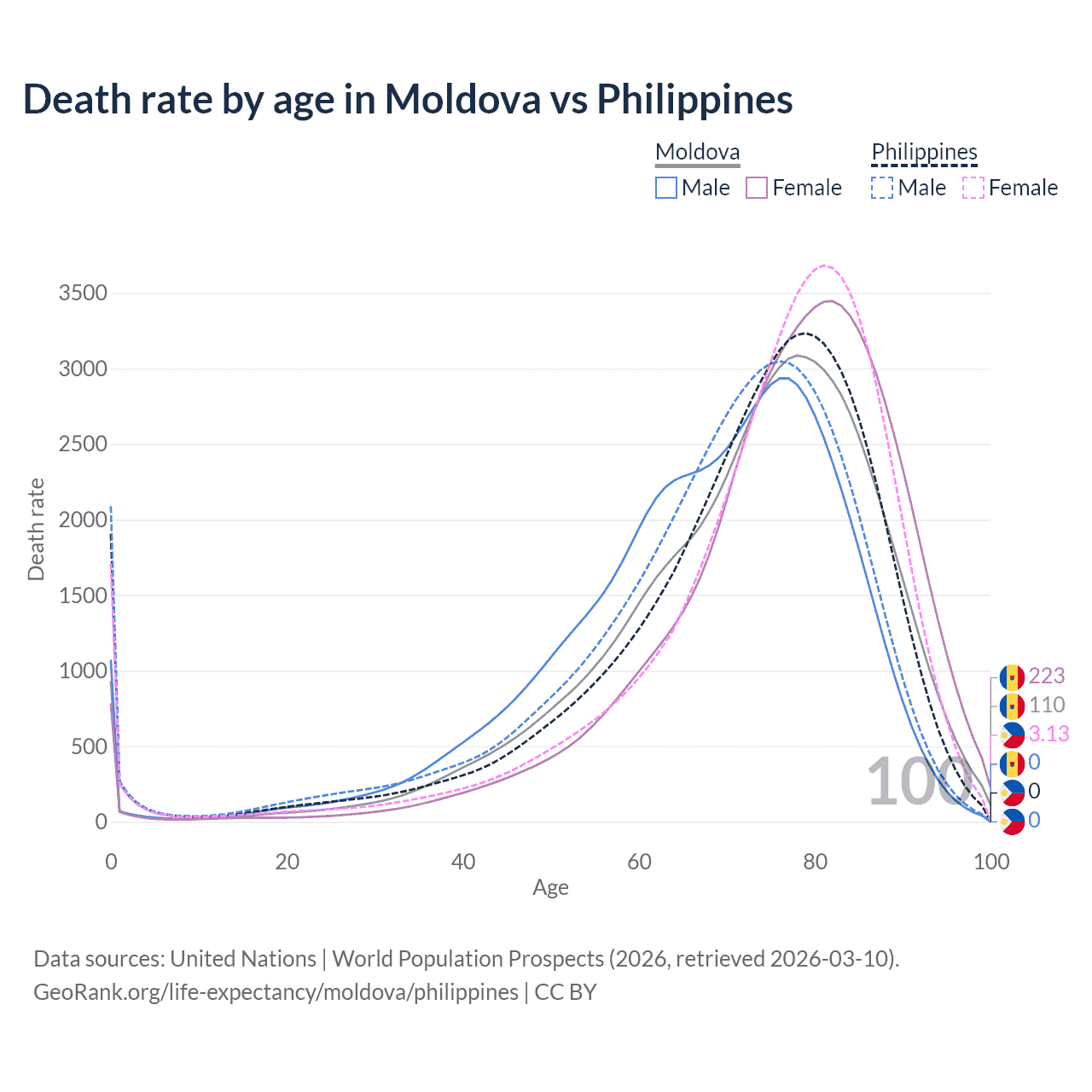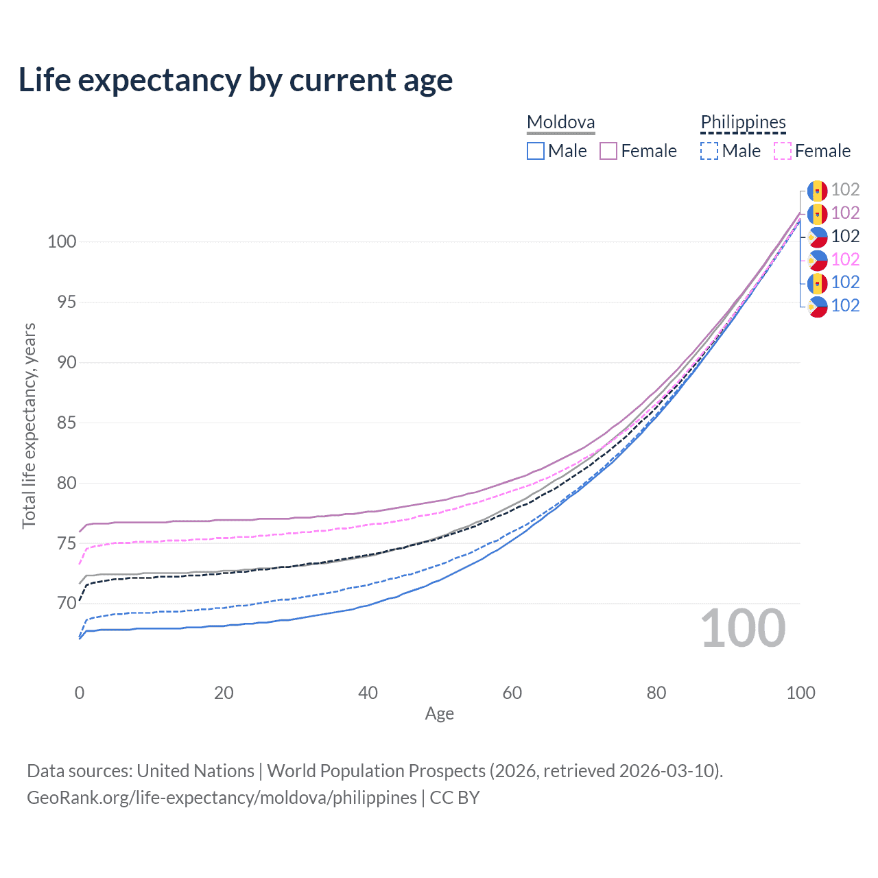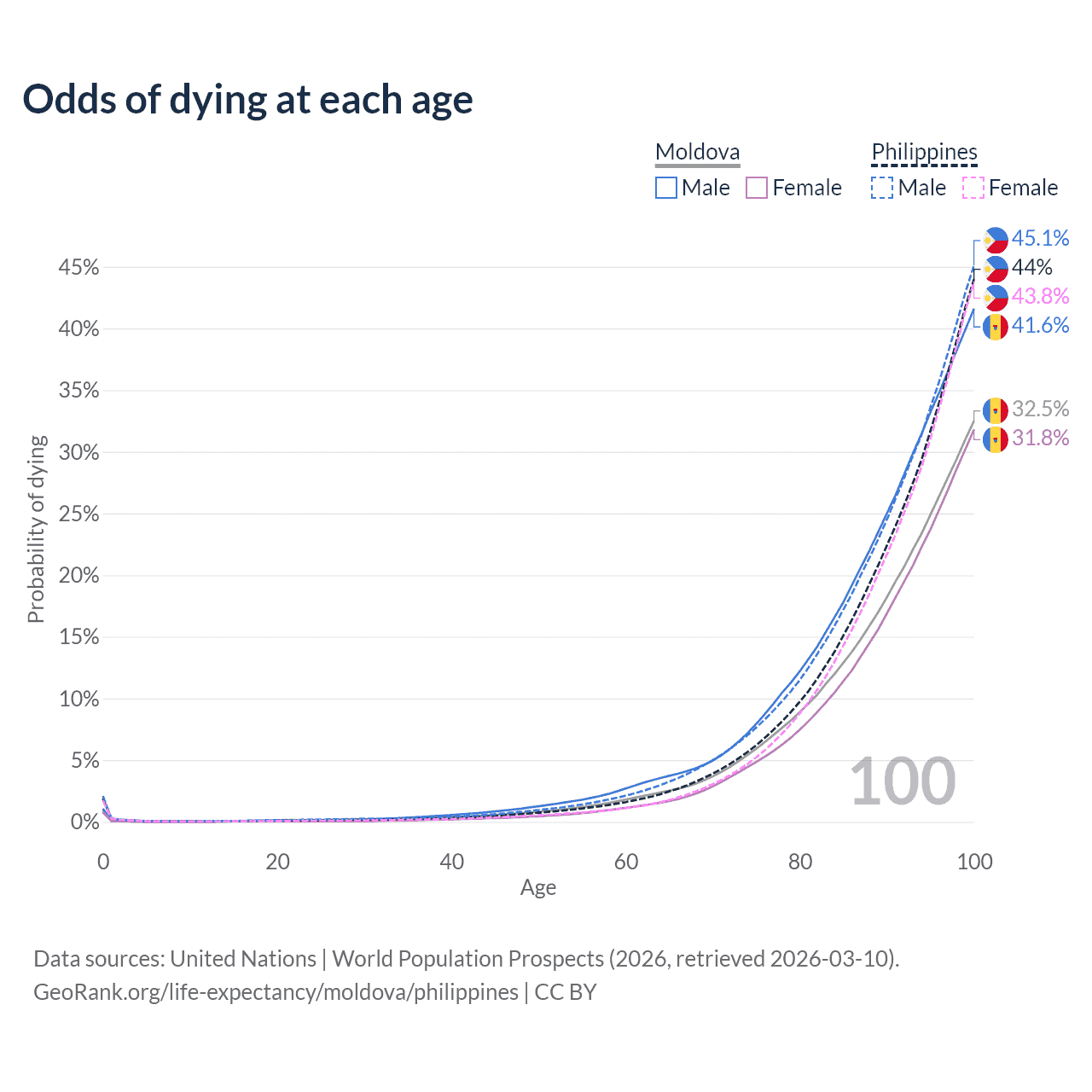 This life expectancy calculator shows the odds of living to 100, 95, 90, and below based on current age for both males and females in Moldova and the Philippines, along with mean and median age of death. The calculations are based on the 2026 life tables (actuarial tables) from the UN World Population Prospects.