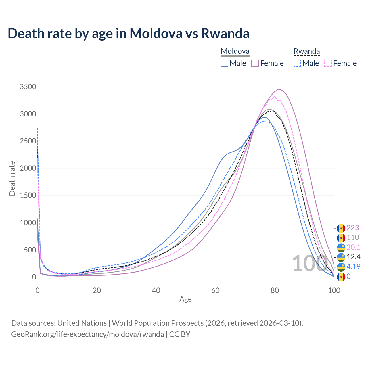 In Moldova, the most common age of death is 78, compared to 78 in Rwanda. The median age of death is 74.8 in Moldova and 73.5 in Rwanda, meaning only half of each cohort is expected to live past that age.