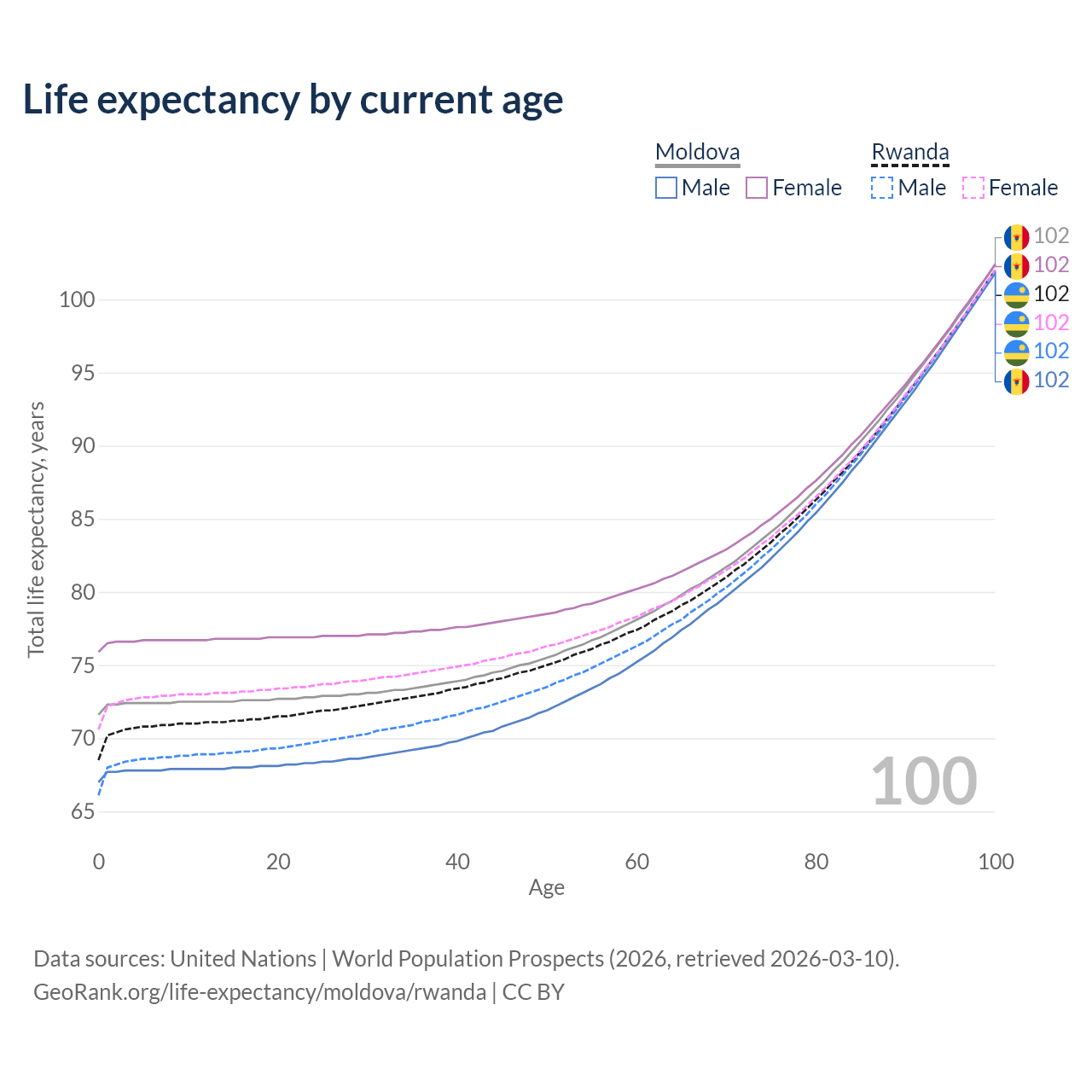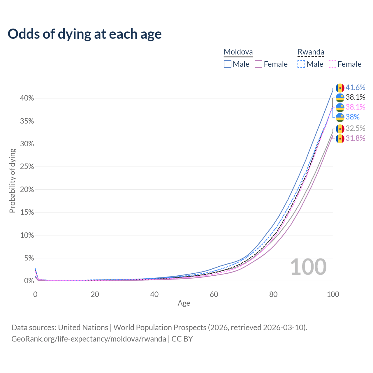 This life expectancy calculator shows the odds of living to 100, 95, 90, and below based on current age for both males and females in Moldova and Rwanda, along with mean and median age of death. The calculations are based on the 2026 life tables (actuarial tables) from the UN World Population Prospects.