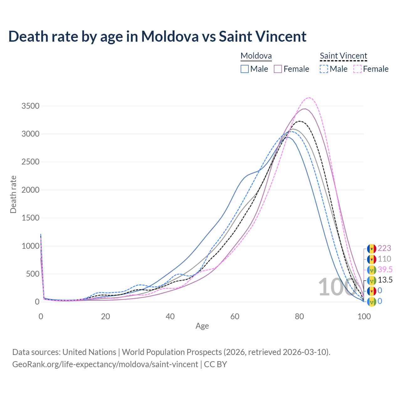 In Moldova, the most common age of death is 78, compared to 80 in Saint Vincent. The median age of death is 74.8 in Moldova and 75.6 in Saint Vincent, meaning only half of each cohort is expected to live past that age.