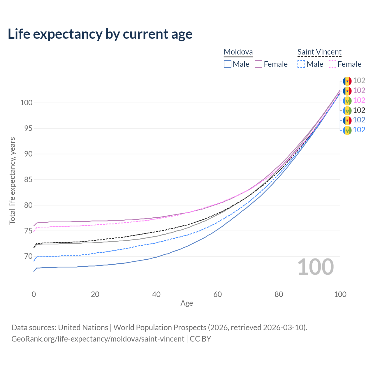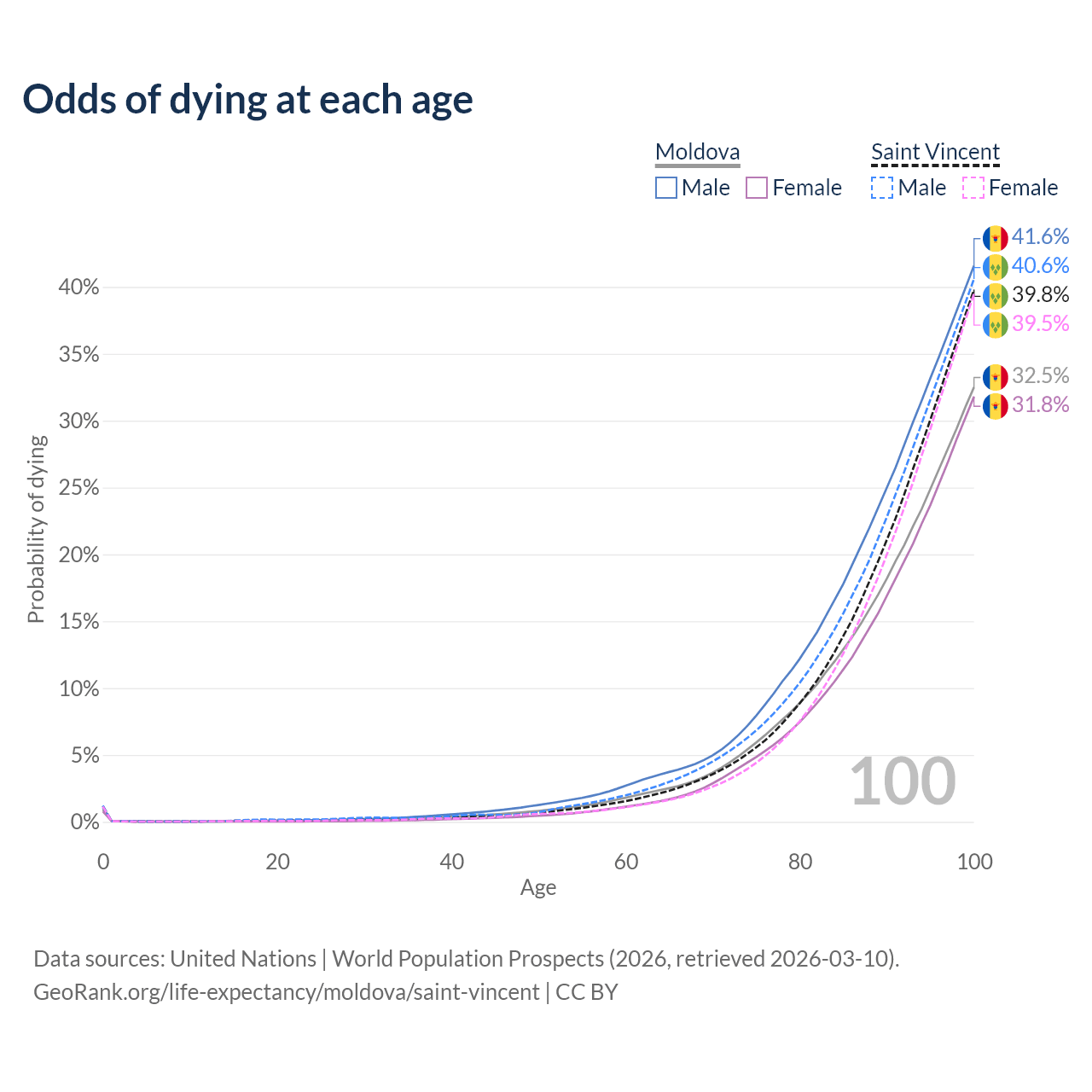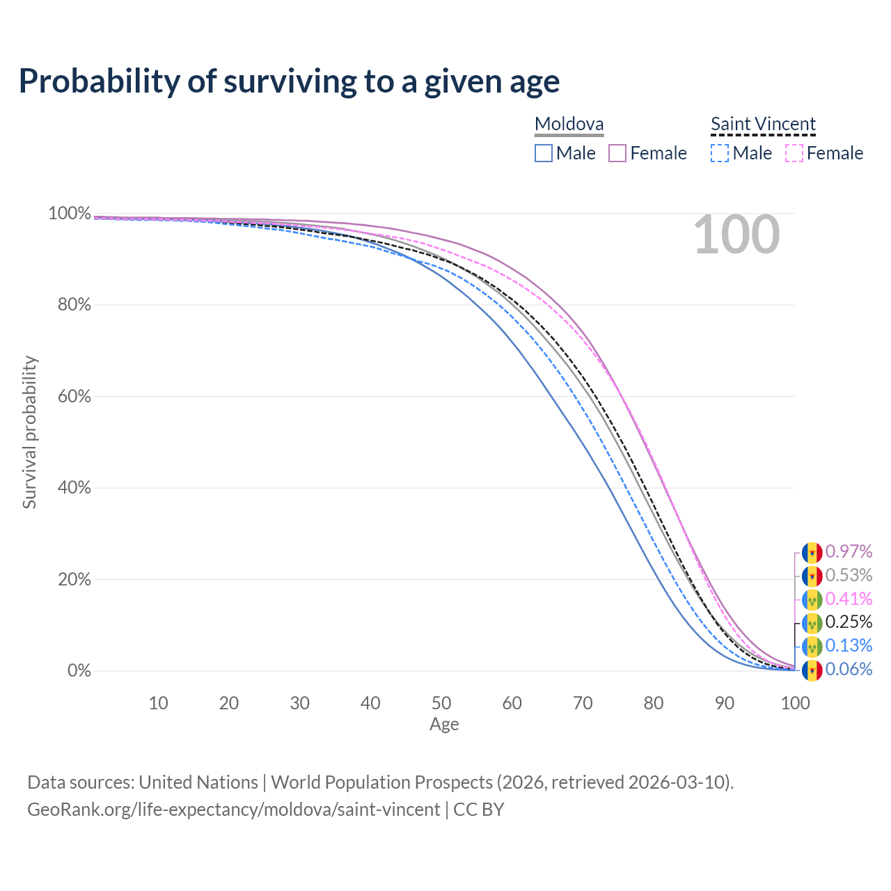 This life expectancy calculator shows the odds of living to 100, 95, 90, and below based on current age for both males and females in Moldova and Saint Vincent, along with mean and median age of death. The calculations are based on the 2026 life tables (actuarial tables) from the UN World Population Prospects.