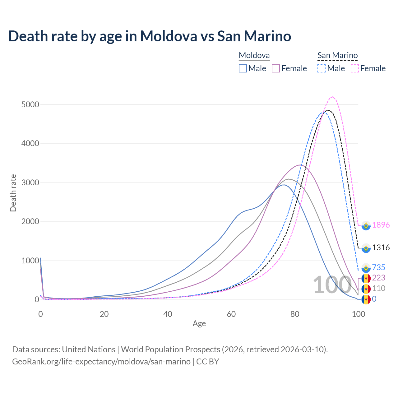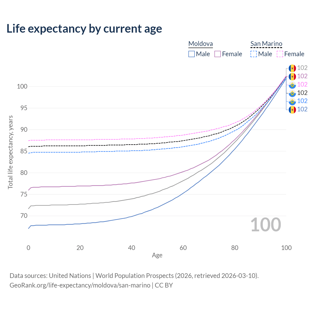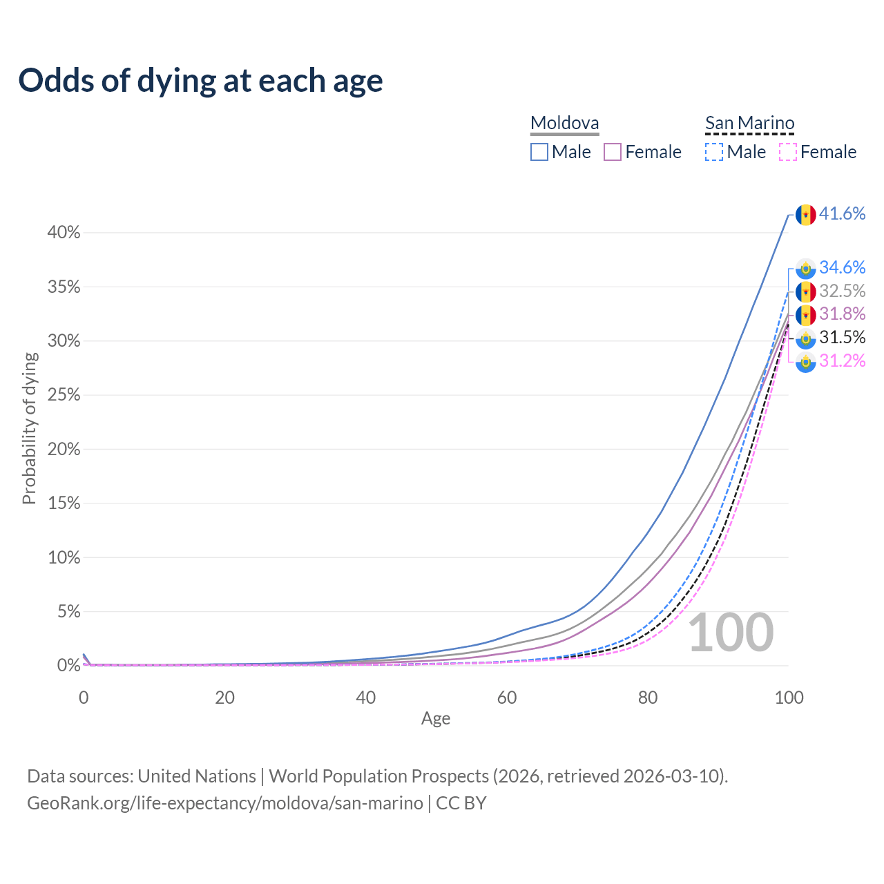 This life expectancy calculator shows the odds of living to 100, 95, 90, and below based on current age for both males and females in Moldova and San Marino, along with mean and median age of death. The calculations are based on the 2026 life tables (actuarial tables) from the UN World Population Prospects.