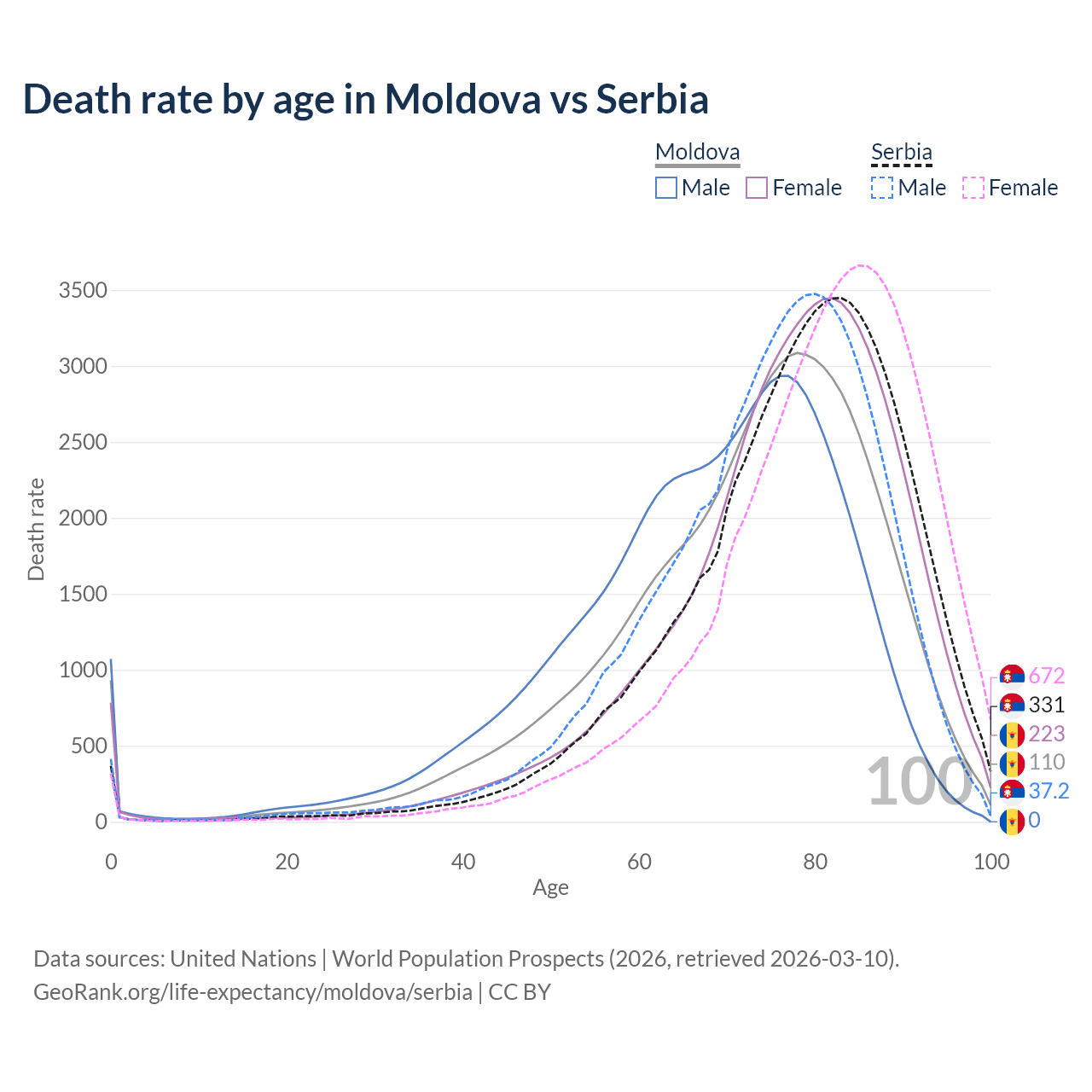 In Moldova, the most common age of death is 78, compared to 83 in Serbia. The median age of death is 74.8 in Moldova and 79.6 in Serbia, meaning only half of each cohort is expected to live past that age.