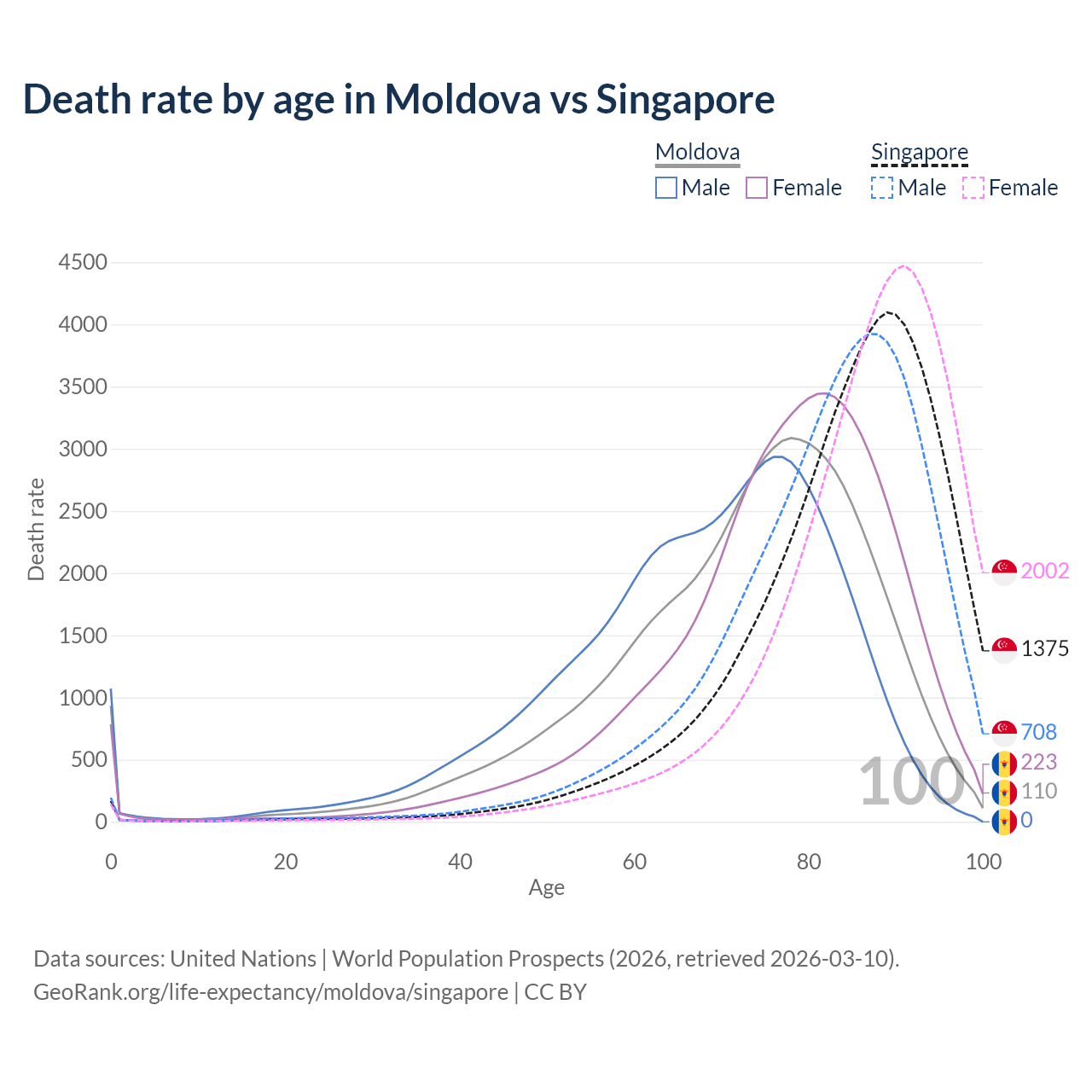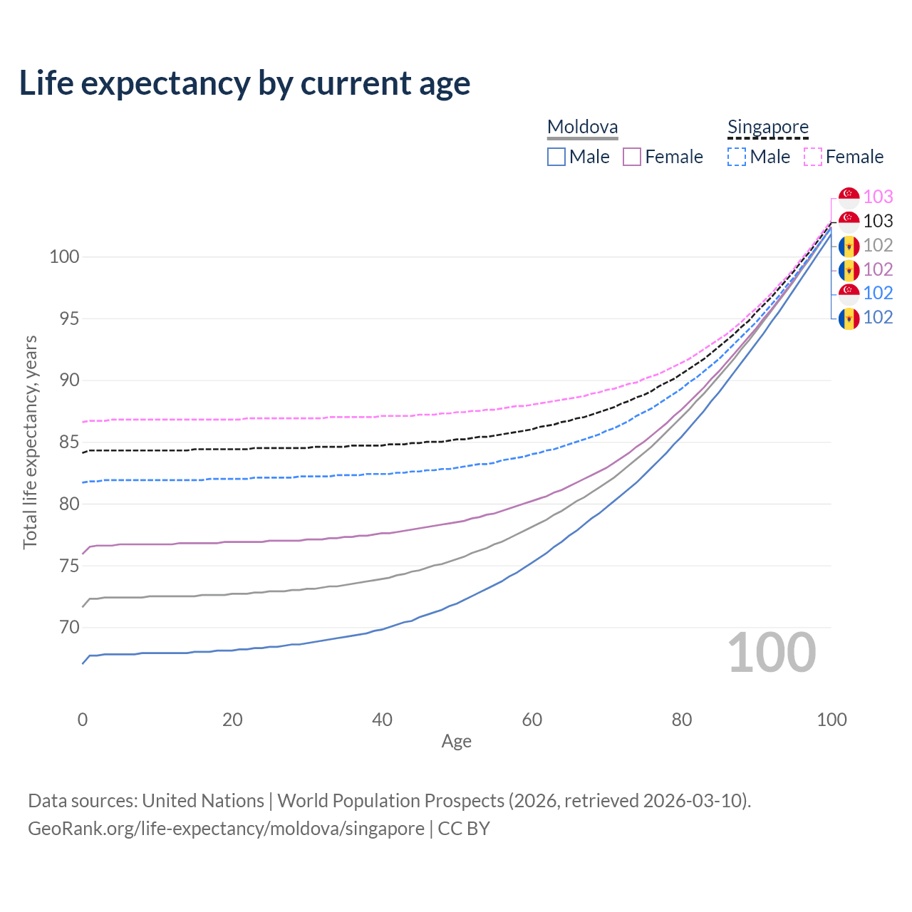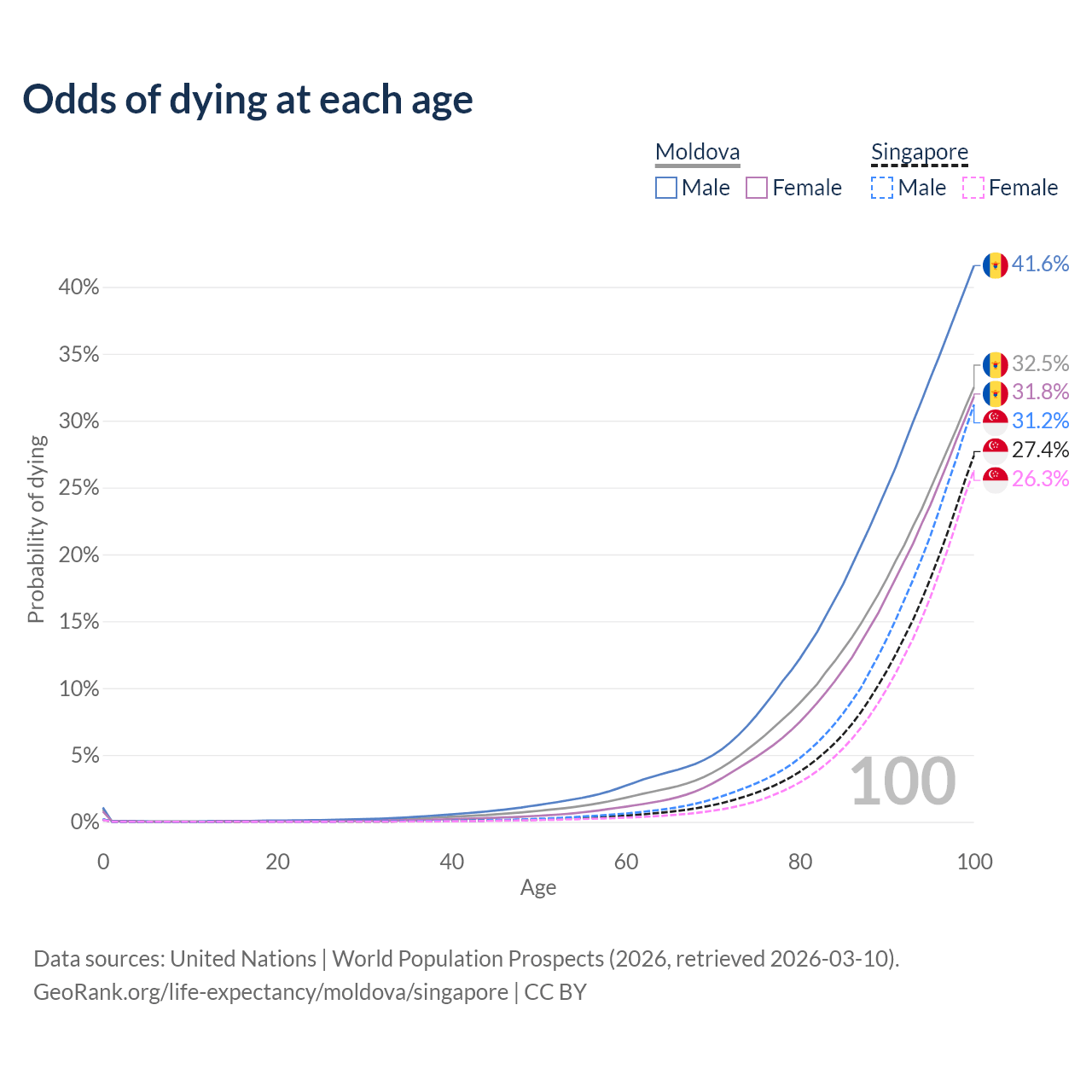 This life expectancy calculator shows the odds of living to 100, 95, 90, and below based on current age for both males and females in Moldova and Singapore, along with mean and median age of death. The calculations are based on the 2026 life tables (actuarial tables) from the UN World Population Prospects.