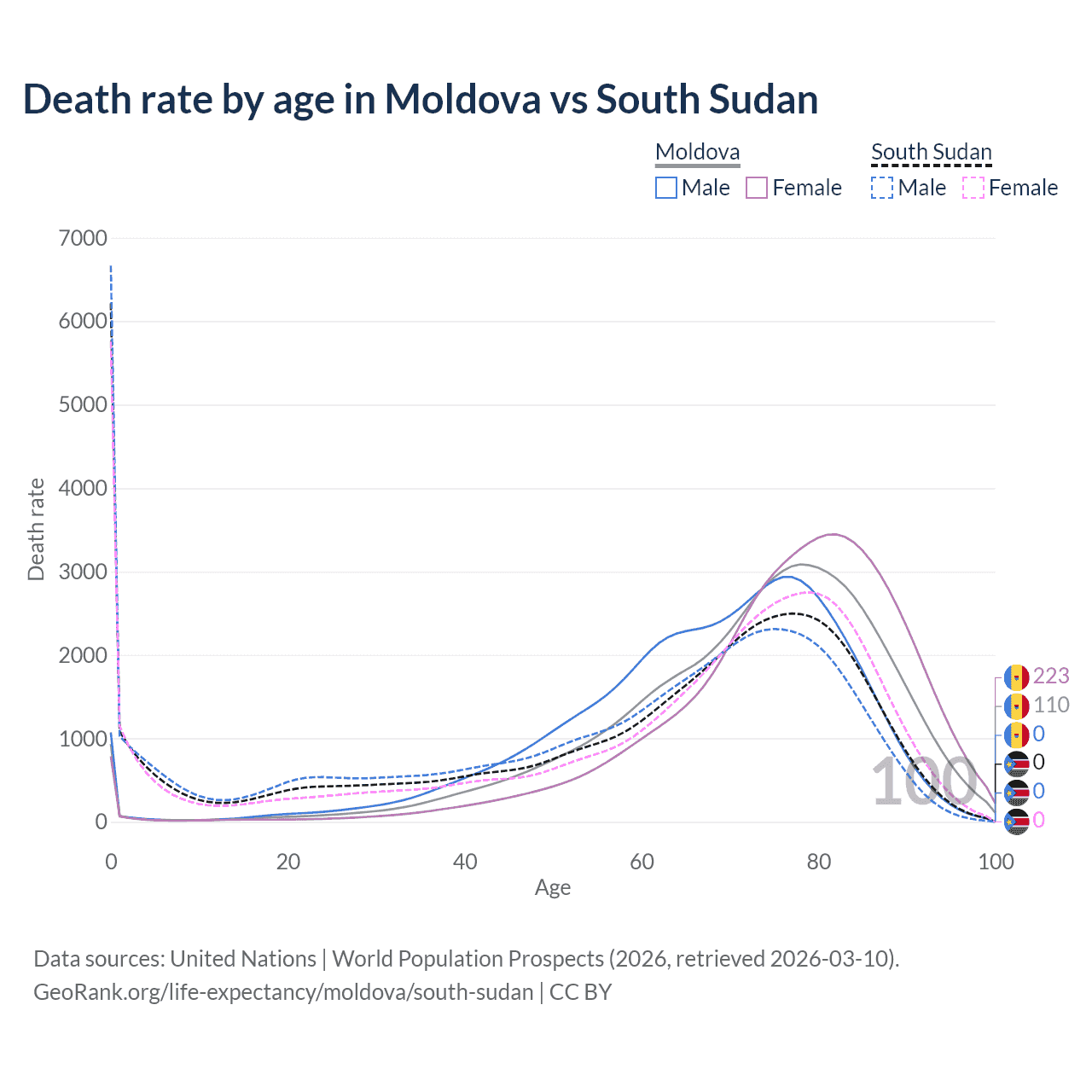 In Moldova, the most common age of death is 78, compared to 0 in South Sudan. The median age of death is 74.8 in Moldova and 67.5 in South Sudan, meaning only half of each cohort is expected to live past that age.