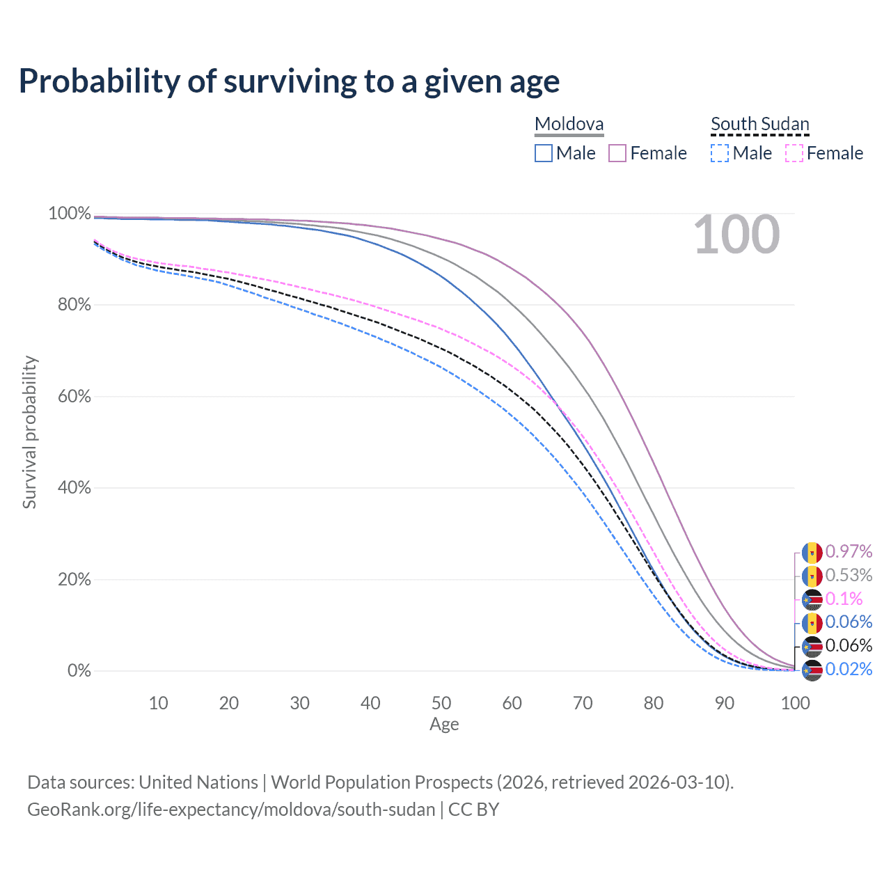 This life expectancy calculator shows the odds of living to 100, 95, 90, and below based on current age for both males and females in Moldova and South Sudan, along with mean and median age of death. The calculations are based on the 2026 life tables (actuarial tables) from the UN World Population Prospects.