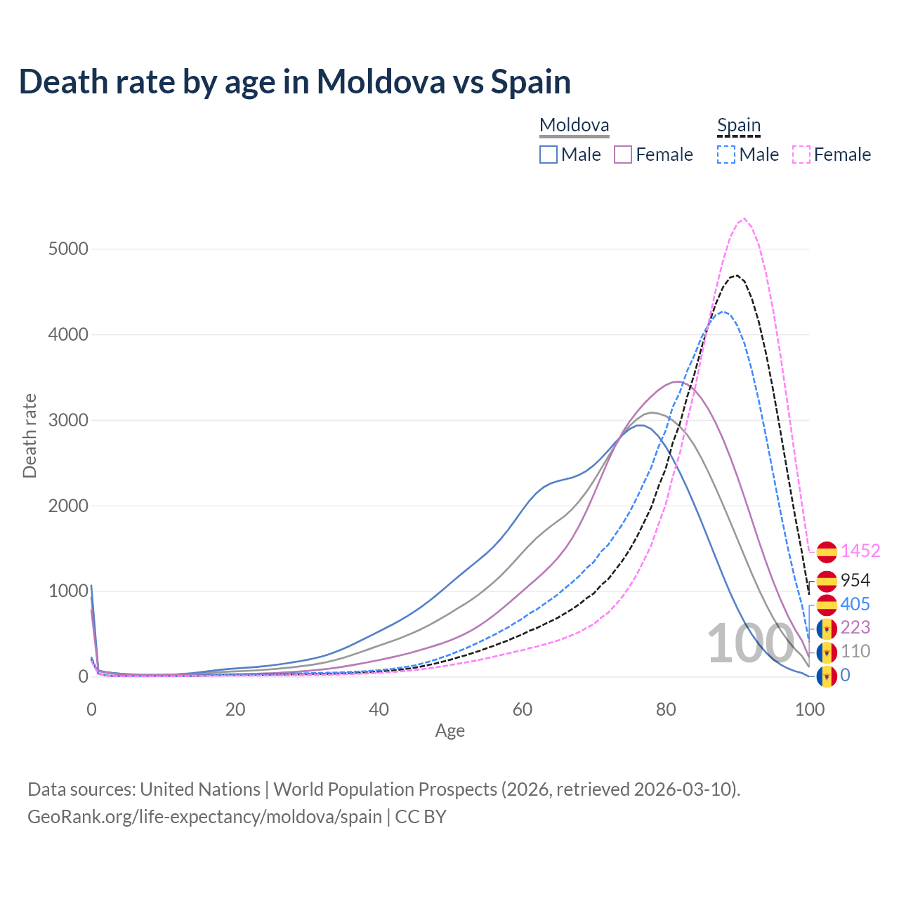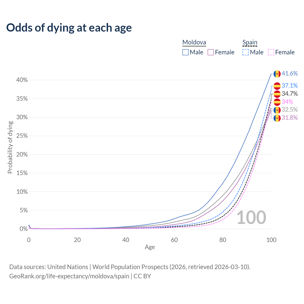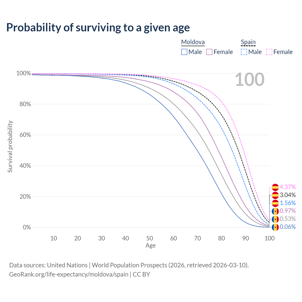 This life expectancy calculator shows the odds of living to 100, 95, 90, and below based on current age for both males and females in Moldova and Spain, along with mean and median age of death. The calculations are based on the 2026 life tables (actuarial tables) from the UN World Population Prospects.