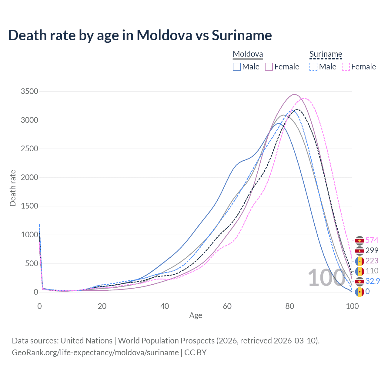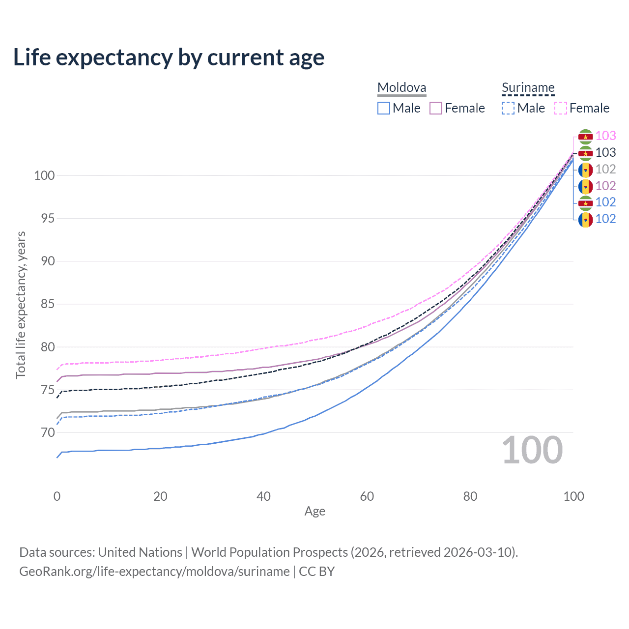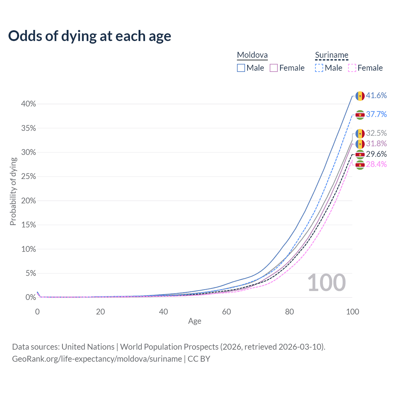 This life expectancy calculator shows the odds of living to 100, 95, 90, and below based on current age for both males and females in Moldova and Suriname, along with mean and median age of death. The calculations are based on the 2026 life tables (actuarial tables) from the UN World Population Prospects.