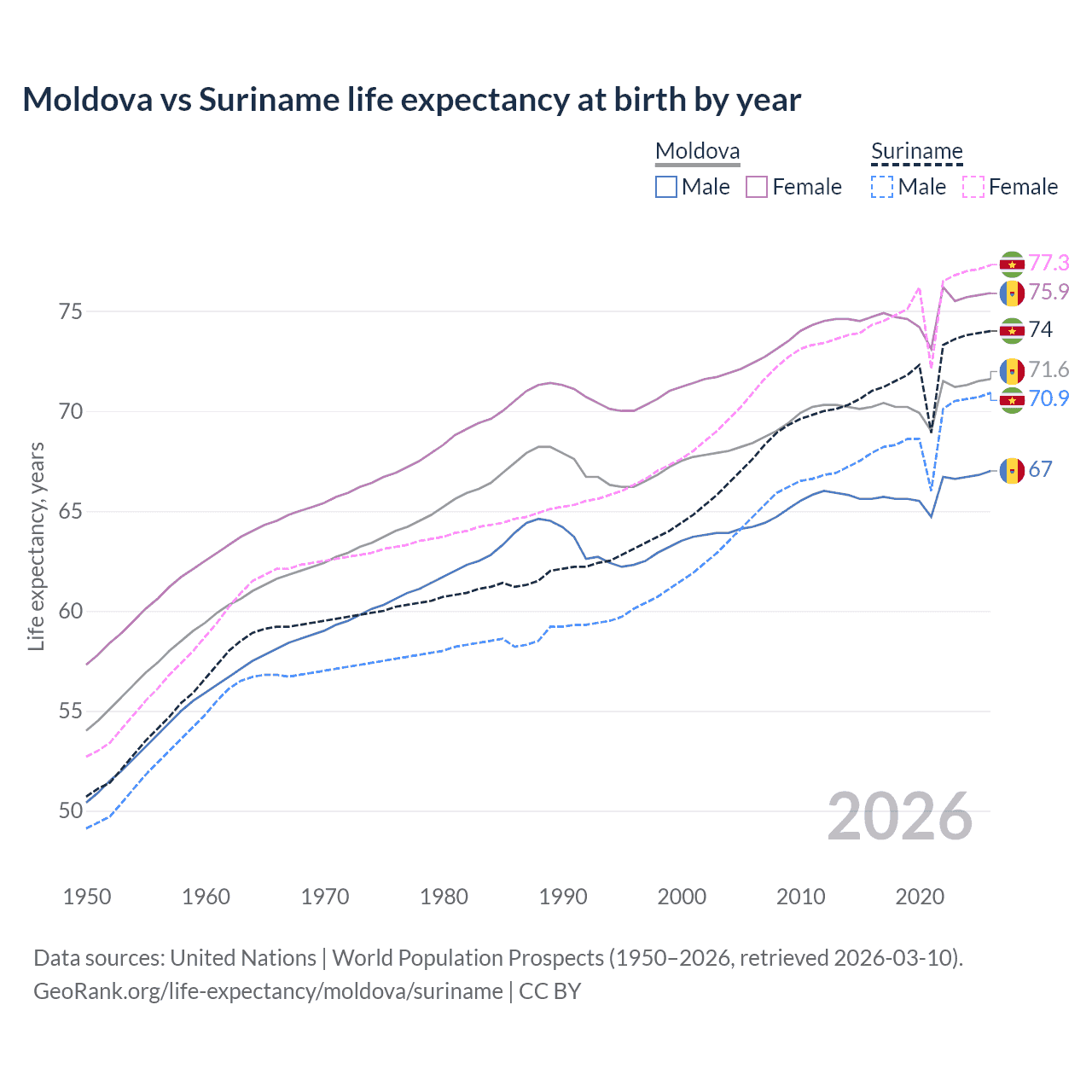 GeoRank.org/life-expectancy/moldova/suriname | CC BY